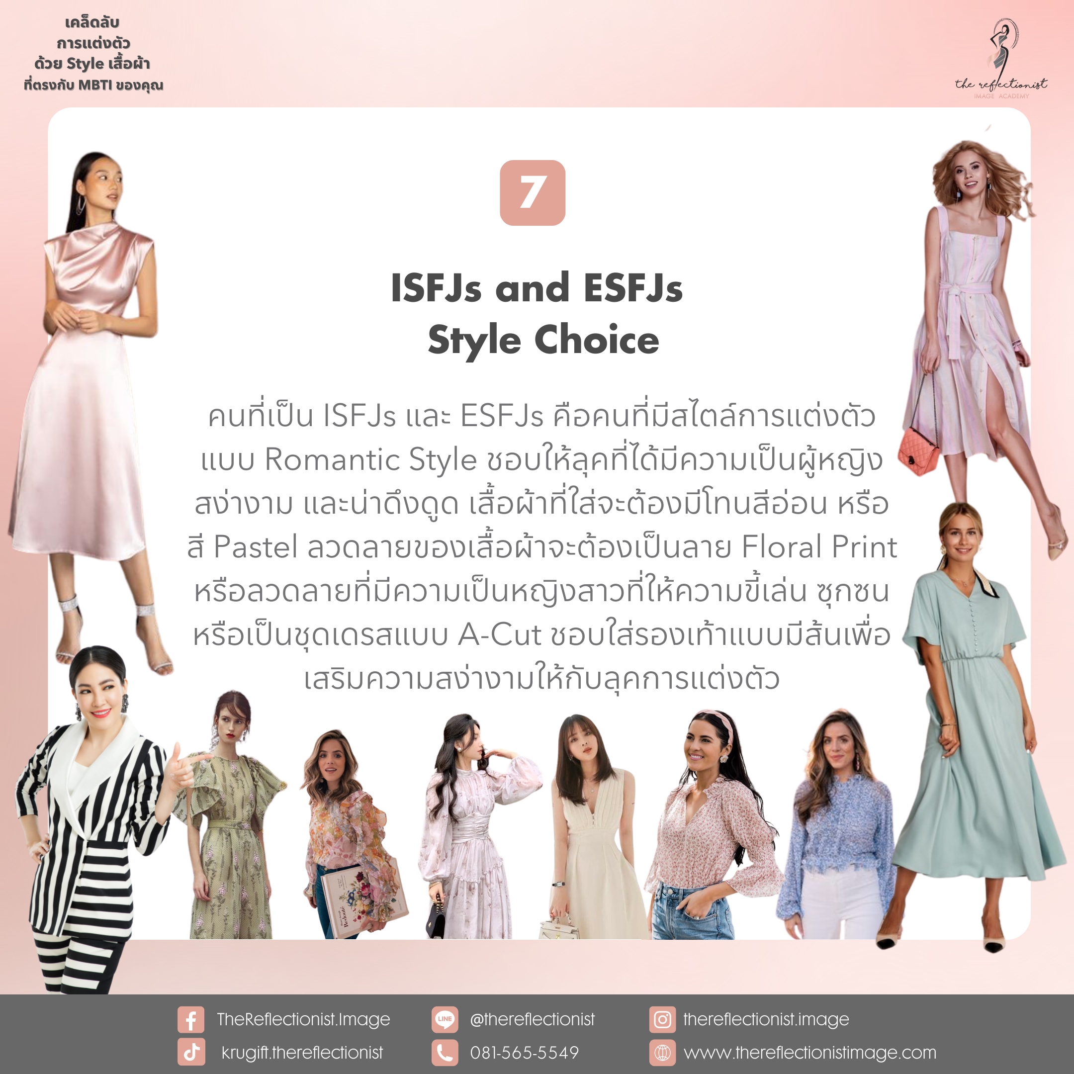 คนที่เป็น ISFJs และ ESFJs คือคนที่มีสไตล์การแต่งตัวแบบ Romantic Style ชอบให้ลุคที่ได้มีความเป็นผู้หญิง สง่างาม และน่าดึงดูด เสื้อผ้าที่ใส่จะต้องมีโทนสีอ่อน หรือสี Pastel ลวดลายของเสื้อผ้าจะต้องเป็นลาย Floral Print หรือลวดลายที่มีความเป็นหญิงสาวที่ให้ความขี้เล่น ซุกซน หรือเป็นชุดเดรสแบบ A-Cut ชอบใส่รองเท้าแบบมีส้นเพื่อเสริมความสง่างามให้กับลุคการแต่งตัว
