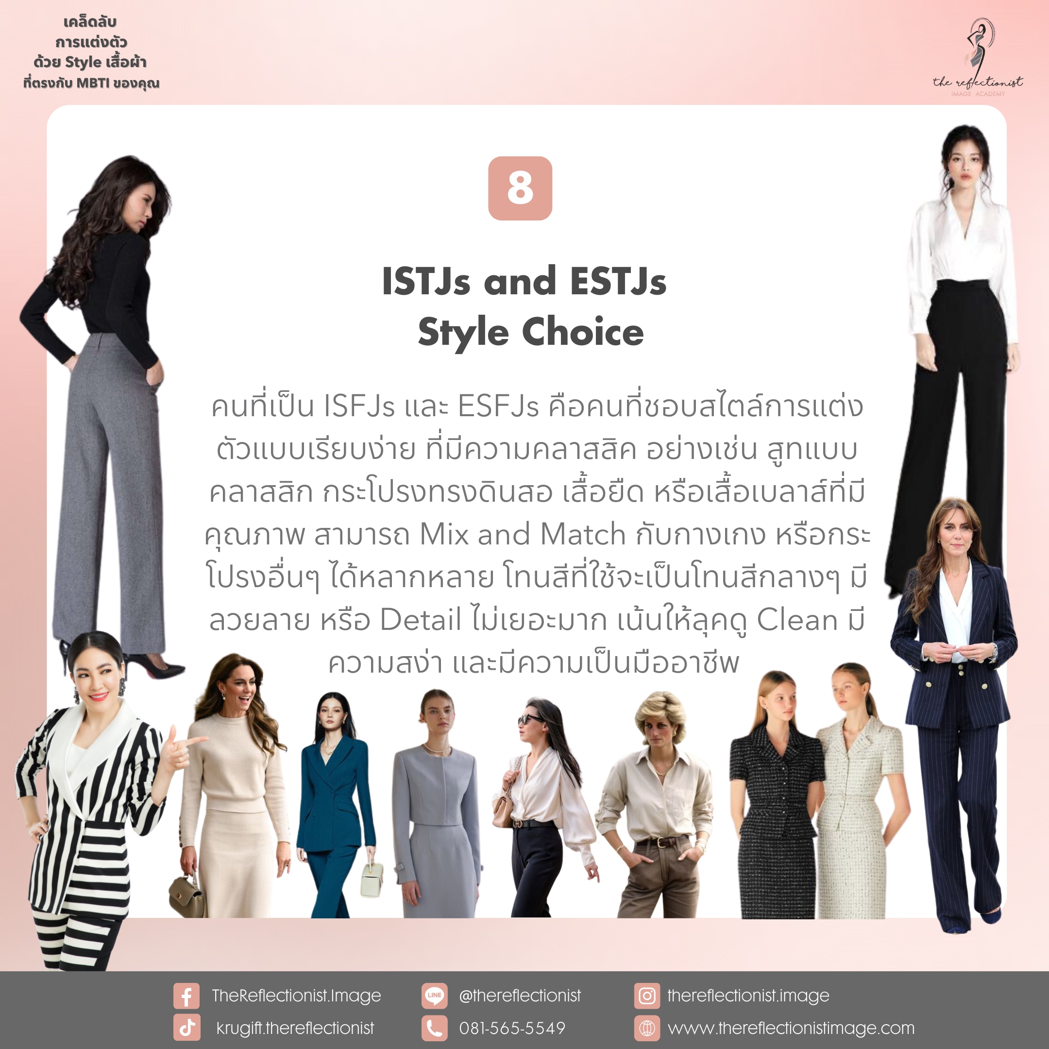 คนที่เป็น ISFJs และ ESFJs คือคนที่ชอบสไตล์การแต่งตัวแบบเรียบง่าย ที่มีความคลาสสิค อย่างเช่น สูทแบบคลาสสิก กระโปรงทรงดินสอ เสื้อยืด หรือเสื้อเบลาส์ที่มีคุณภาพ สามารถ Mix and Match กับกางเกง หรือกระโปรงอื่นๆ ได้หลากหลาย โทนสีที่ใช้จะเป็นโทนสีกลางๆ มีลวยลาย หรือ Detail ไม่เยอะมาก เน้นให้ลุคดู Clean มีความสง่า และมีความเป็นมืออาชีพ