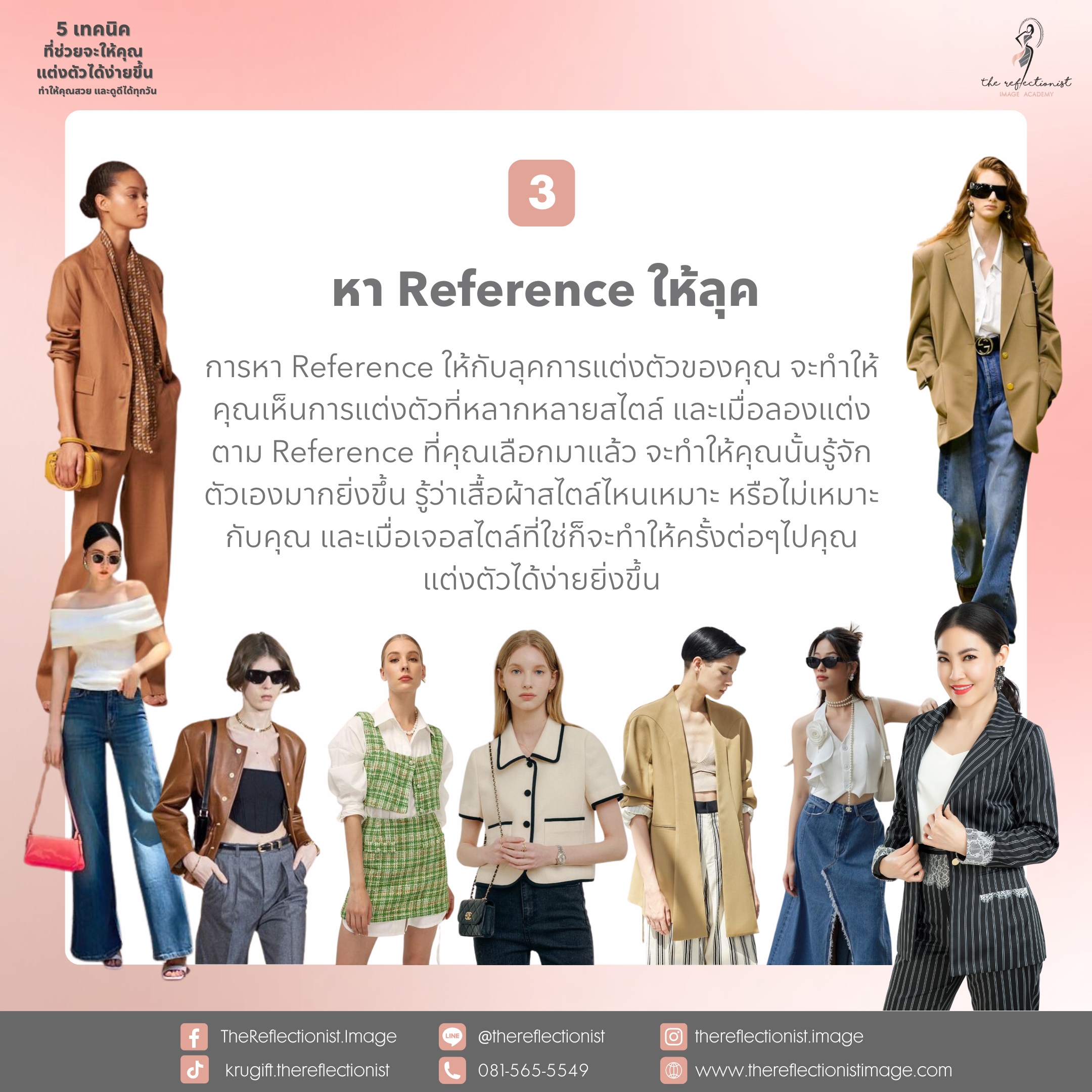 การหา Reference ให้กับลุคการแต่งตัวของคุณ จะทำให้คุณเห็นการแต่งตัวที่หลากหลายสไตล์ และเมื่อลองแต่งตาม Reference ที่คุณเลือกมาแล้ว จะทำให้คุณนั้นรู้จักตัวเองมากยิ่งขึ้น รู้ว่าเสื้อผ้าสไตล์ไหนเหมาะ หรือไม่เหมาะกับคุณ และเมื่อเจอสไตล์ที่ใช่ก็จะทำให้ครั้งต่อๆไปคุณแต่งตัวได้ง่ายยิ่งขึ้น