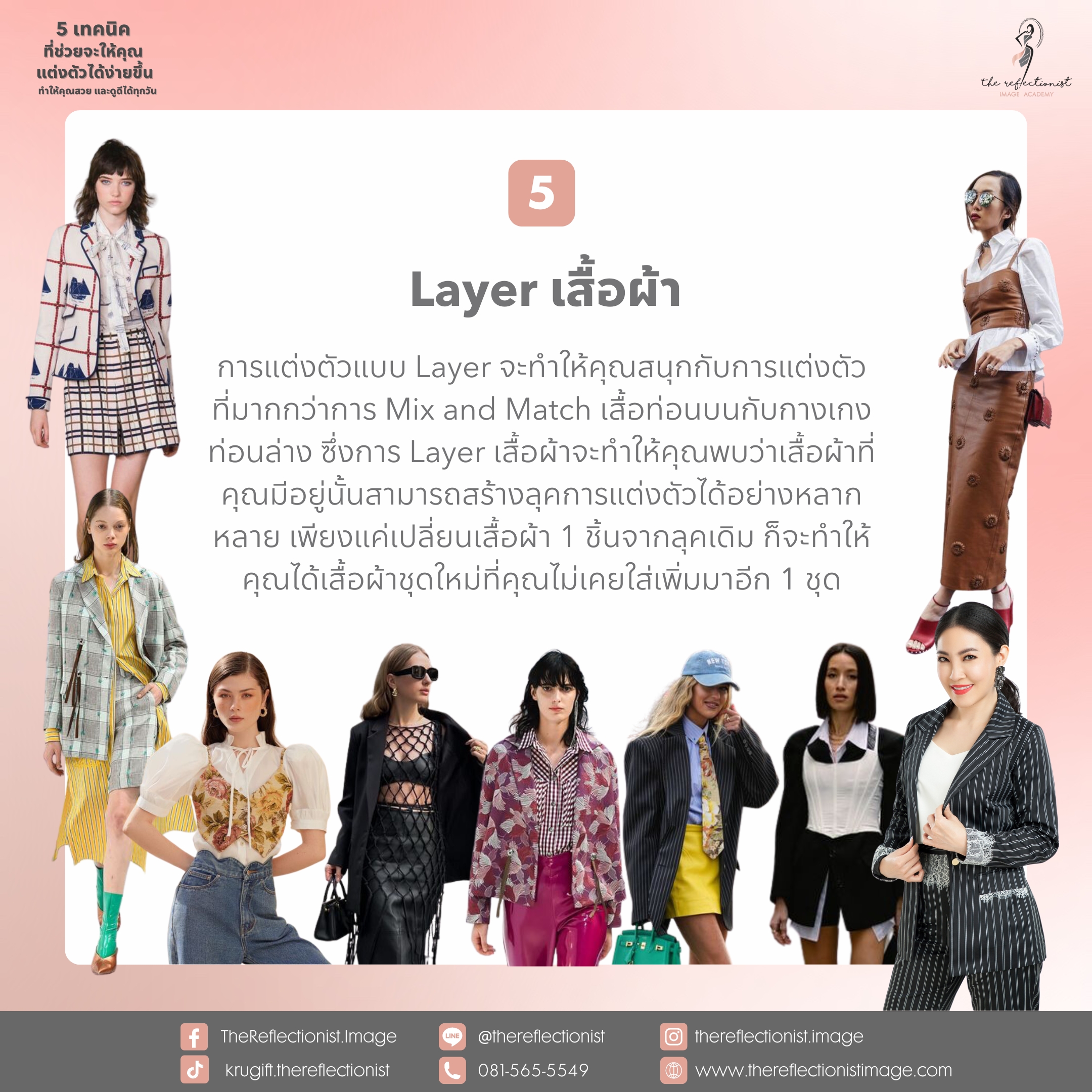 การแต่งตัวแบบ Layer จะทำให้คุณสนุกกับการแต่งตัวที่มากกว่าการ Mix and Match เสื้อท่อนบนกับกางเกงท่อนล่าง ซึ่งการ Layer เสื้อผ้าจะทำให้คุณพบว่าเสื้อผ้าที่คุณมีอยู่นั้นสามารถสร้างลุคการแต่งตัวได้อย่างหลากหลาย เพียงแค่เปลี่ยนเสื้อผ้า 1 ชิ้นจากลุคเดิม ก็จะทำให้คุณได้เสื้อผ้าชุดใหม่ที่คุณไม่เคยใส่เพิ่มมาอีก 1 ชุด