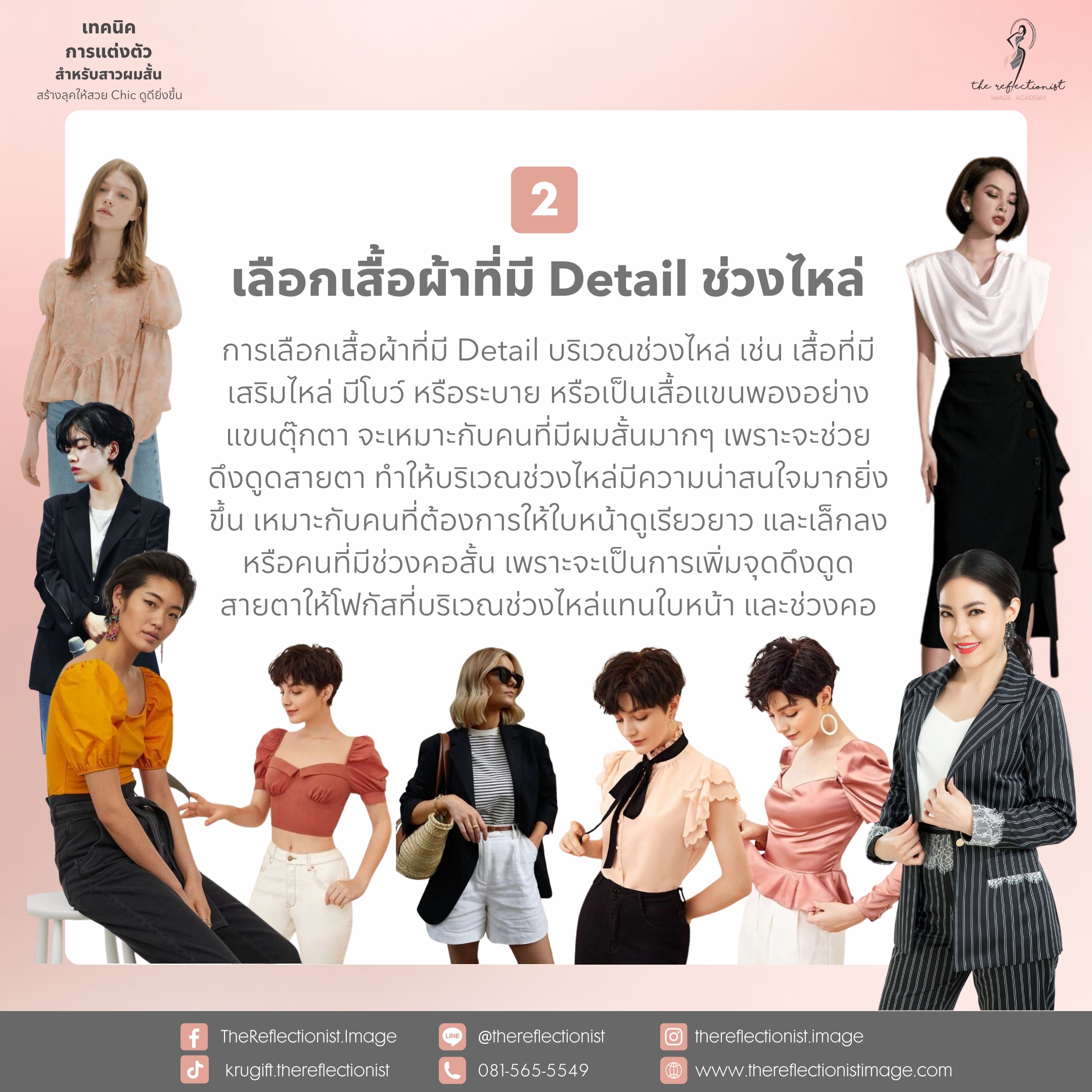 การเลือกเสื้อผ้าที่มี Detail บริเวณช่วงไหล่ เช่น เสื้อที่มีเสริมไหล่ มีโบว์ หรือระบาย หรือเป็นเสื้อแขนพองอย่างแขนตุ๊กตา จะเหมาะกับคนที่มีผมสั้นมากๆ เพราะจะช่วยดึงดูดสายตา ทำให้บริเวณช่วงไหล่มีความน่าสนใจมากยิ่งขึ้น เหมาะกับคนที่ต้องการให้ใบหน้าดูเรียวยาว และเล็กลง หรือคนที่มีช่วงคอสั้น เพราะจะเป็นการเพิ่มจุดดึงดูดสายตาให้โฟกัสที่บริเวณช่วงไหล่แทนใบหน้า และช่วงคอ