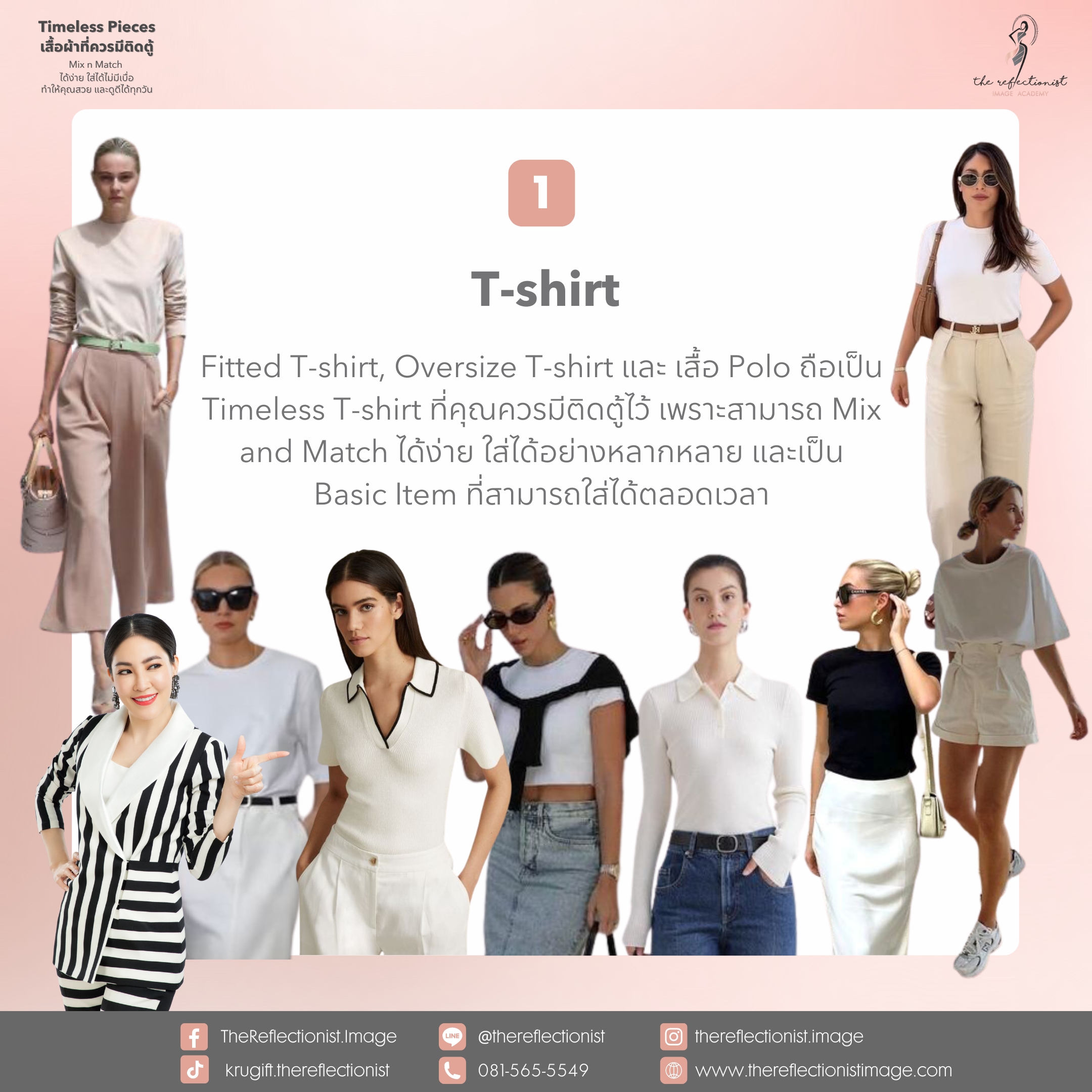 Fitted T-shirt, Oversize T-shirt และ เสื้อ Polo ถือเป็น Timeless T-shirt ที่คุณควรมีติดตู้ไว้ เพราะสามารถ Mix and Match ได้ง่าย ใส่ได้อย่างหลากหลาย และเป็น Basic Item ที่สามารถใส่ได้ตลอดเวลา