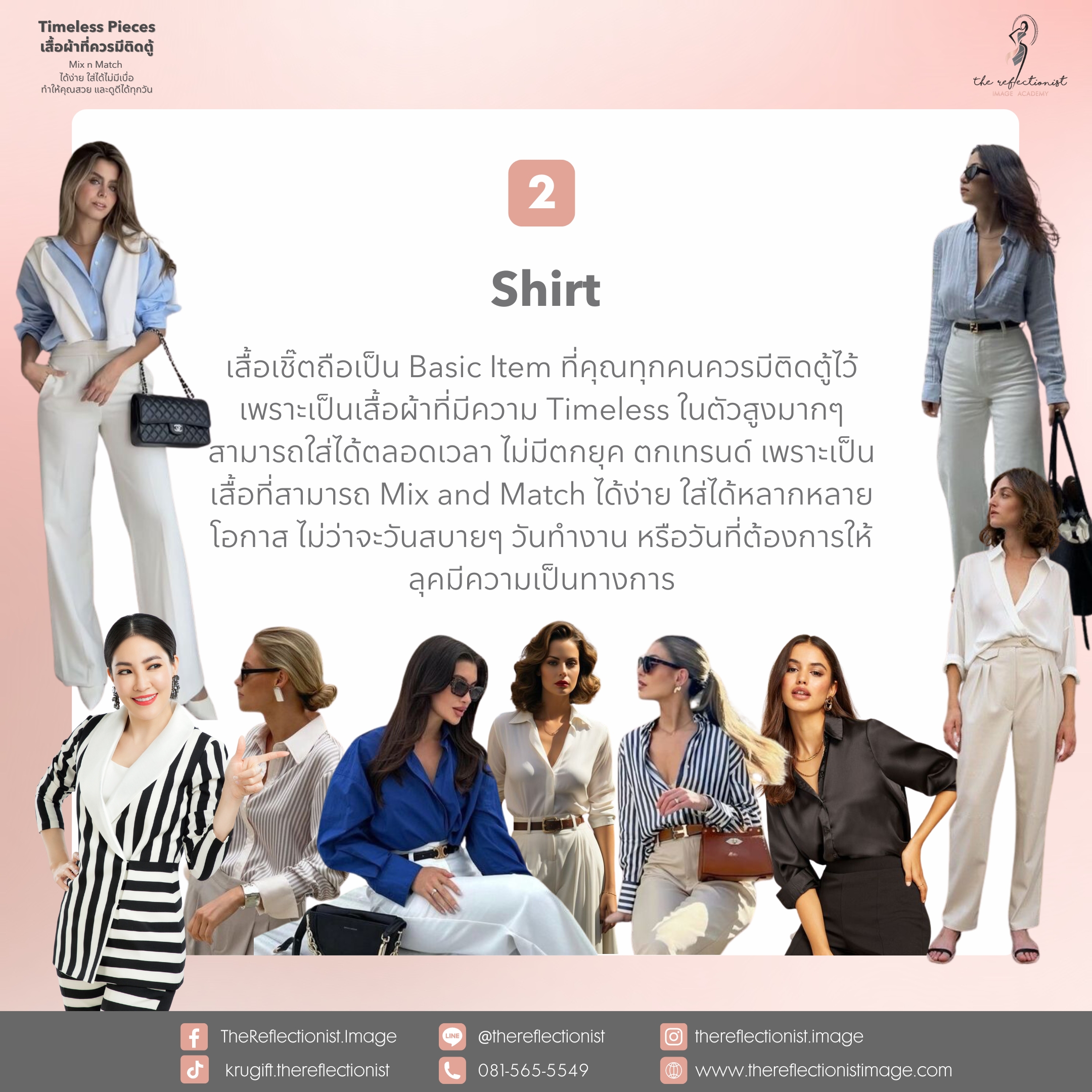 เสื้อเชิ๊ตถือเป็น Basic Item ที่คุณทุกคนควรมีติดตู้ไว้ เพราะเป็นเสื้อผ้าที่มีความ Timeless ในตัวสูงมากๆ สามารถใส่ได้ตลอดเวลา ไม่มีตกยุค ตกเทรนด์ เพราะเป็นเสื้อที่สามารถ Mix and Match ได้ง่าย ใส่ได้หลากหลายโอกาส ไม่ว่าจะวันสบายๆ วันทำงาน หรือวันที่ต้องการให้ลุคมีความเป็นทางการ