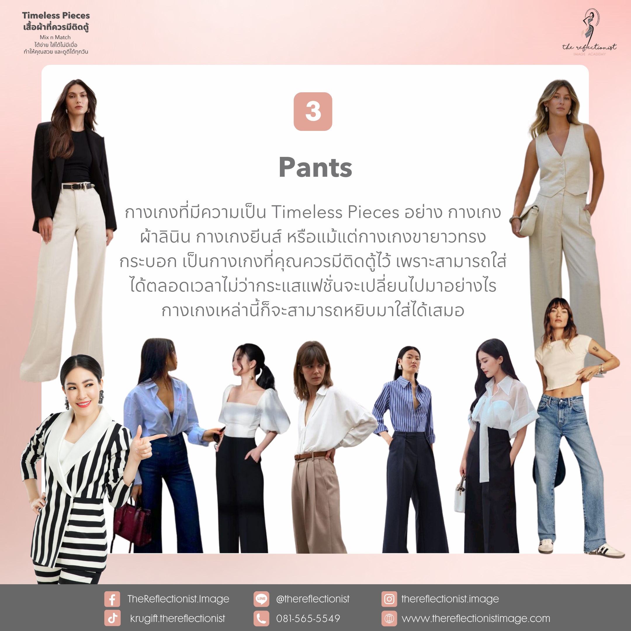 กางเกงที่มีความเป็น Timeless Pieces อย่าง กางเกงผ้าลินิน กางเกงยีนส์ หรือแม้แต่กางเกงขายาวทรงกระบอก เป็นกางเกงที่คุณควรมีติดตู้ไว้ เพราะสามารถใส่ได้ตลอดเวลาไม่ว่ากระแสแฟชั่นจะเปลี่ยนไปมาอย่างไร กางเกงเหล่านี้ก็จะสามารถหยิบมาใส่ได้เสมอ