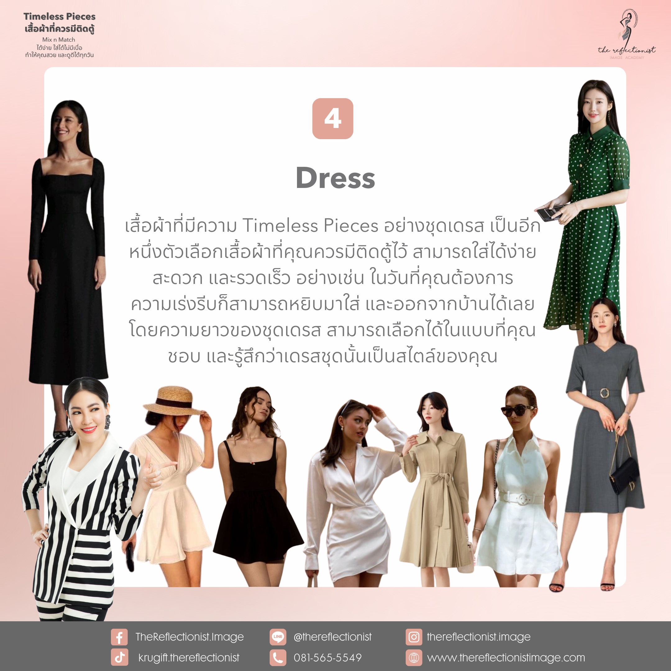 เสื้อผ้าที่มีความ Timeless Pieces อย่างชุดเดรส เป็นอีกหนึ่งตัวเลือกเสื้อผ้าที่คุณควรมีติดตู้ไว้ สามารถใส่ได้ง่าย สะดวก และรวดเร็ว อย่างเช่น ในวันที่คุณต้องการความเร่งรีบก็สามารถหยิบมาใส่ และออกจากบ้านได้เลย โดยความยาวของชุดเดรส สามารถเลือกได้ในแบบที่คุณชอบ และรู้สึกว่าเดรสชุดนั้นเป็นสไตล์ของคุณ