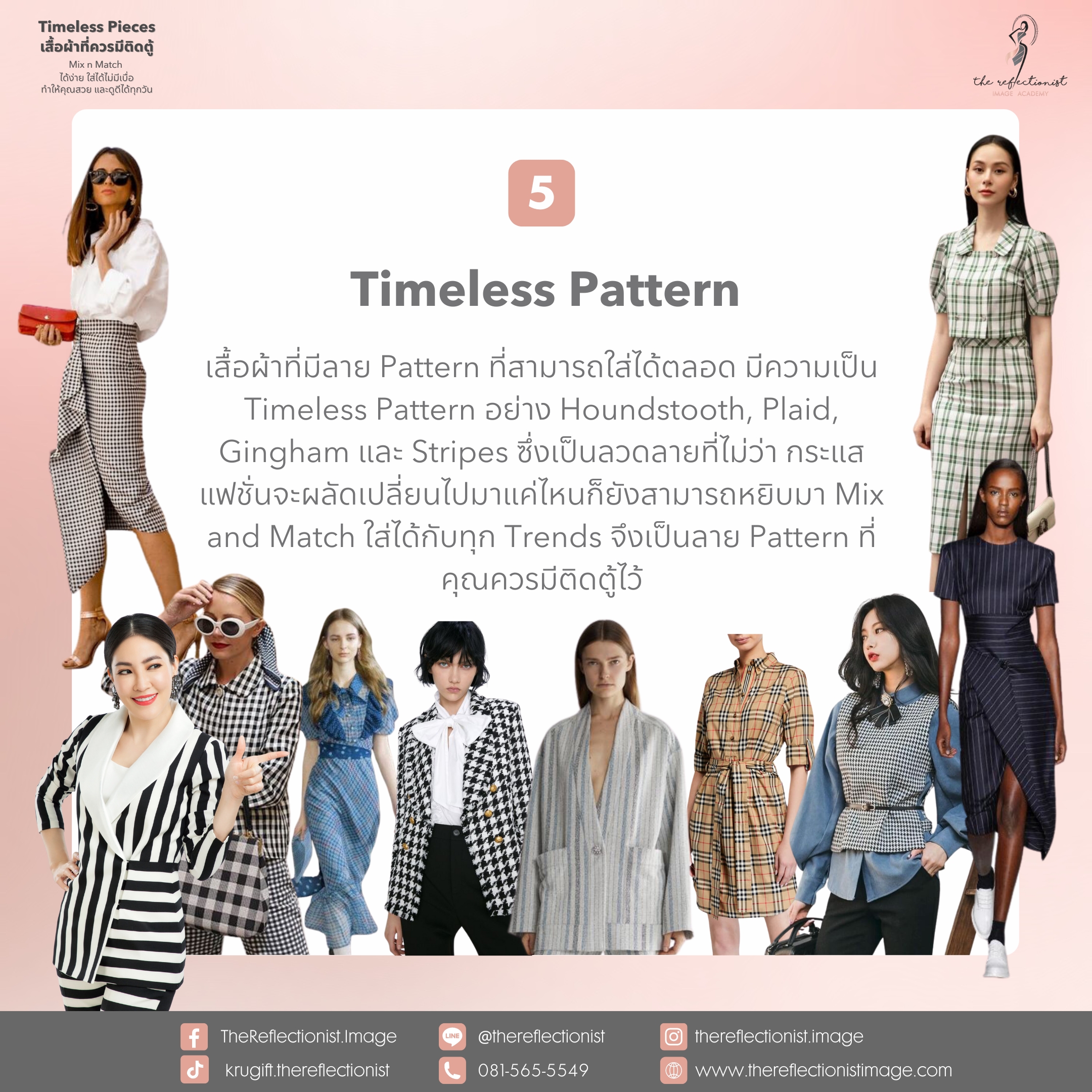 เสื้อผ้าที่มีลาย Pattern ที่สามารถใส่ได้ตลอด มีความเป็น Timeless Pattern อย่าง Houndstooth, Plaid, Gingham และ Stripes ซึ่งเป็นลวดลายที่ไม่ว่า กระแสแฟชั่นจะผลัดเปลี่ยนไปมาแค่ไหนก็ยังสามารถหยิบมา Mix and Match ใส่ได้กับทุก Trends จึงเป็นลาย Pattern ที่คุณควรมีติดตู้ไว้