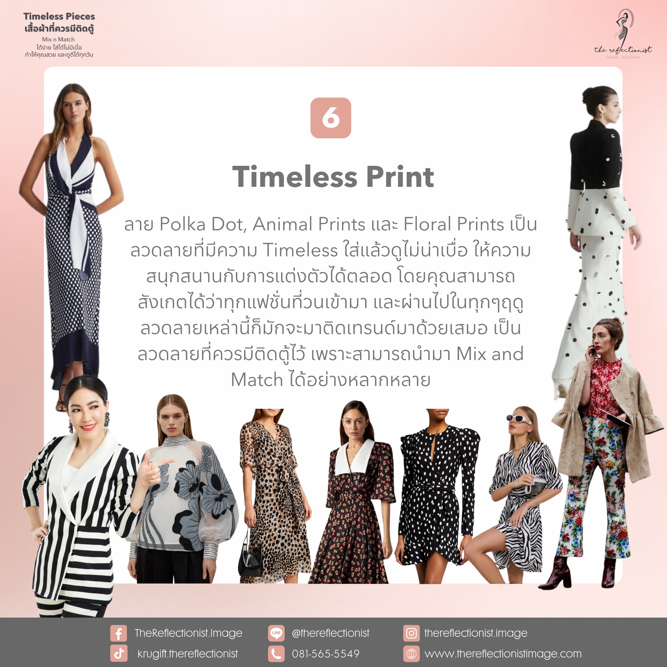 ลาย Polka Dot, Animal Prints และ Floral Prints เป็นลวดลายที่มีความ Timeless ใส่แล้วดูไม่น่าเบื่อ ให้ความสนุกสนานกับการแต่งตัวได้ตลอด โดยคุณสามารถสังเกตได้ว่าทุกแฟชั่นที่วนเข้ามา และผ่านไปในทุกๆฤดู ลวดลายเหล่านี้ก็มักจะมาติดเทรนด์มาด้วยเสมอ เป็นลวดลายที่ควรมีติดตู้ไว้ เพราะสามารถนำมา Mix and Match ได้อย่างหลากหลาย