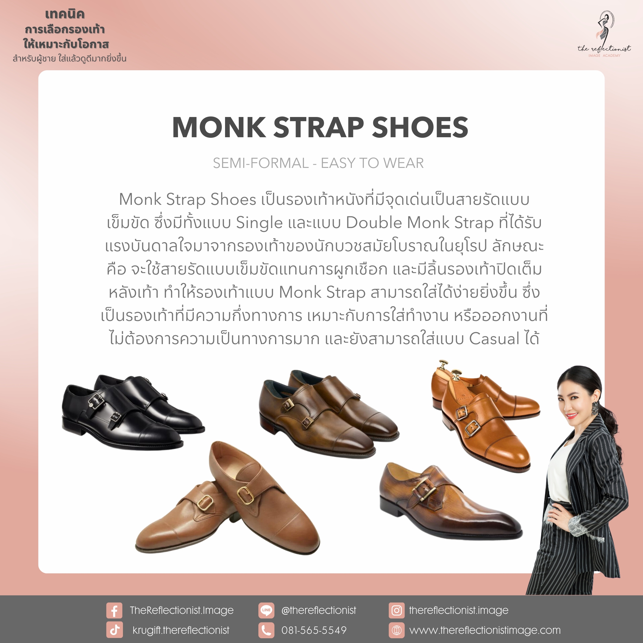 Monk Strap Shoes เป็นรองเท้าหนังที่มีจุดเด่นเป็นสายรัดแบบเข็มขัด ซึ่งมีทั้งแบบ Single และแบบ Double Monk Strap ที่ได้รับแรงบันดาลใจมาจากรองเท้าของนักบวชสมัยโบราณในยุโรป ลักษณะคือ จะใช้สายรัดแบบเข็มขัดแทนการผูกเชือก และมีลิ้นรองเท้าปิดเต็มหลังเท้า ทำให้รองเท้าแบบ Monk Strap สามารถใส่ได้ง่ายยิ่งขึ้น ซึ่งเป็นรองเท้าที่มีความกึ่งทางการ เหมาะกับการใส่ทำงาน หรือออกงานที่ไม่ต้องการความเป็นทางการมาก และยังสามารถใส่แบบ Casual ได้