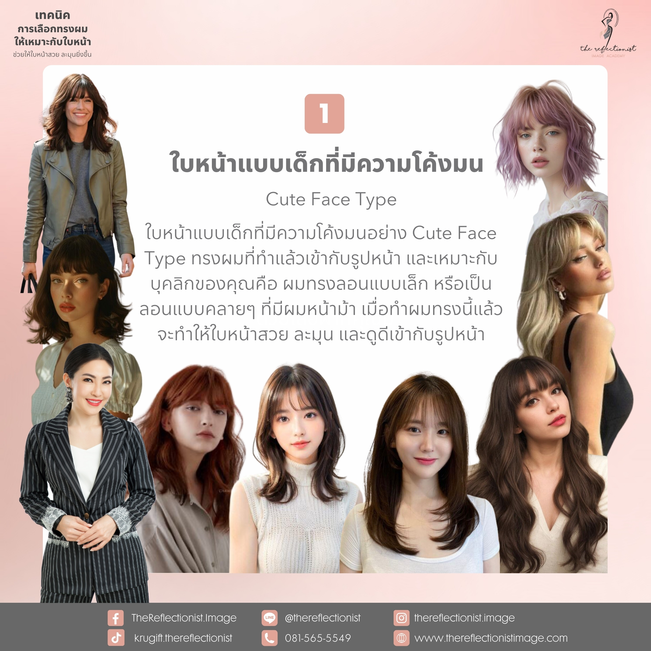 ใบหน้าแบบเด็กที่มีความโค้งมนอย่าง Cute Face Type ทรงผมที่ทำแล้วเข้ากับรูปหน้า และเหมาะกับบุคลิกของคุณคือ ผมทรงลอนแบบเล็ก หรือเป็นลอนแบบคลายๆ ที่มีผมหน้าม้า เมื่อทำผมทรงนี้แล้วจะทำให้ใบหน้าสวย ละมุน และดูดีเข้ากับรูปหน้า