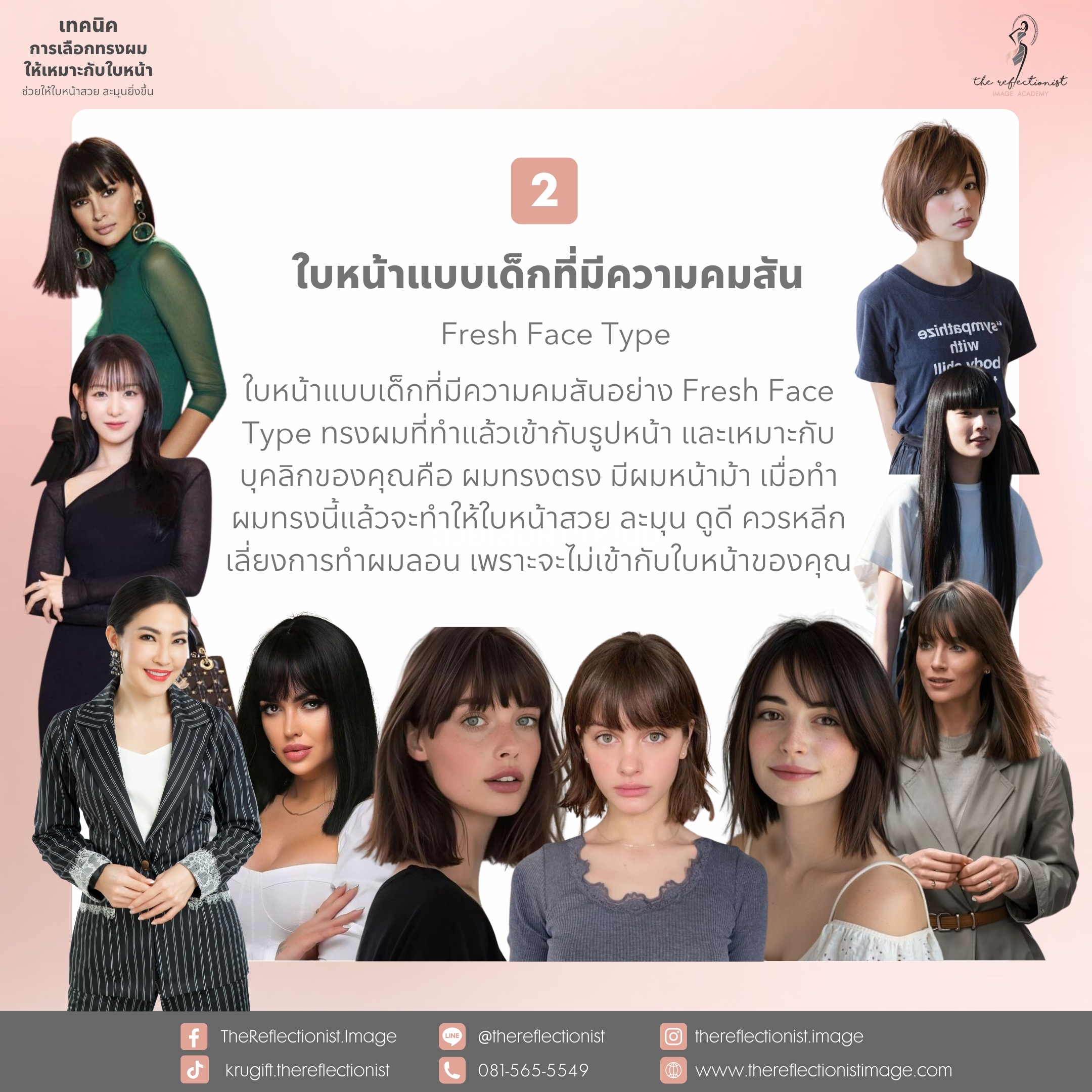 ใบหน้าแบบเด็กที่มีความคมสันอย่าง Fresh Face Type ทรงผมที่ทำแล้วเข้ากับรูปหน้า และเหมาะกับบุคลิกของคุณคือ ผมทรงตรง มีผมหน้าม้า เมื่อทำผมทรงนี้แล้วจะทำให้ใบหน้าสวย ละมุน ดูดี ควรหลีกเลี่ยงการทำผมลอน เพราะจะไม่เข้ากับใบหน้าของคุณ