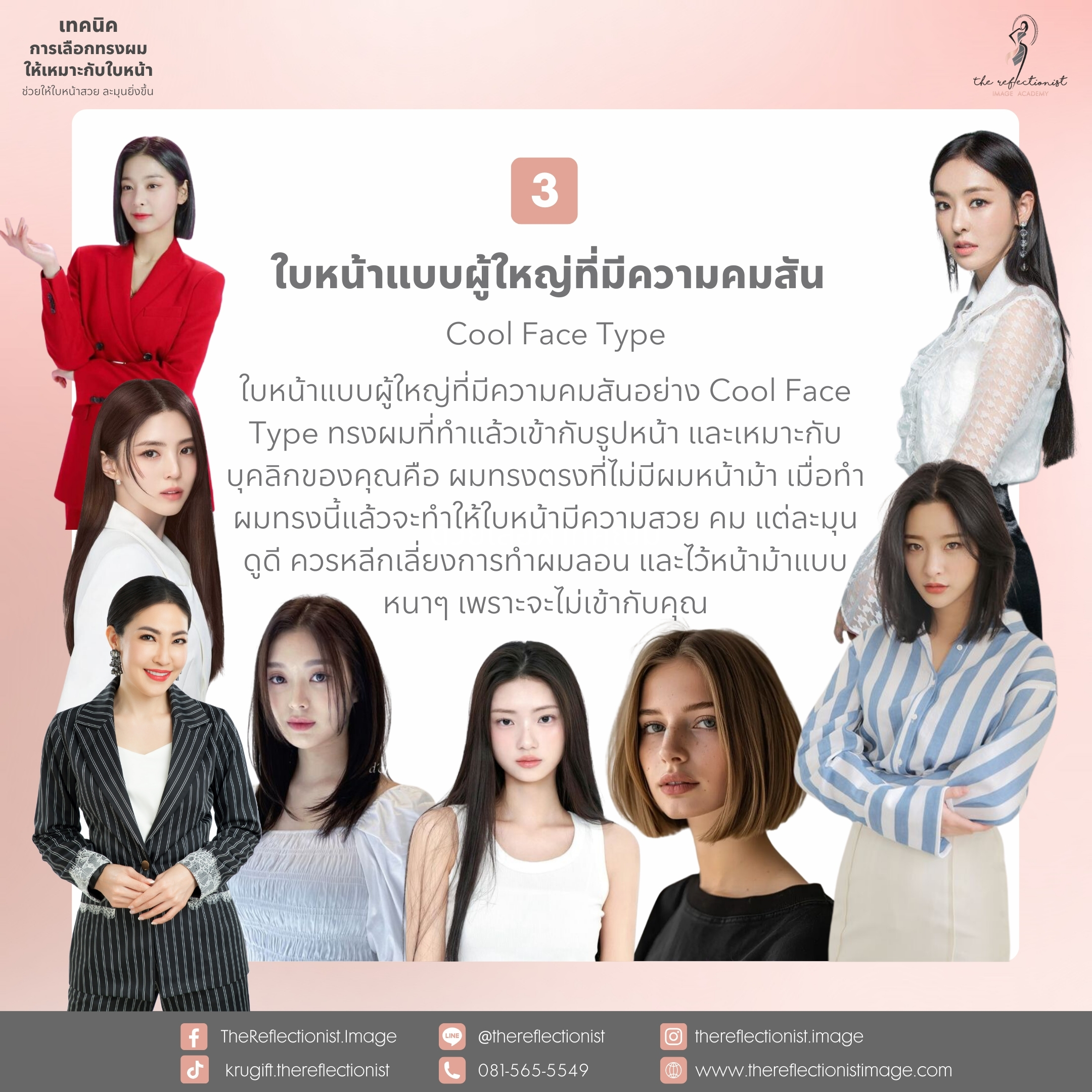 ใบหน้าแบบผู้ใหญ่ที่มีความคมสันอย่าง Cool Face Type ทรงผมที่ทำแล้วเข้ากับรูปหน้า และเหมาะกับบุคลิกของคุณคือ ผมทรงตรงที่ไม่มีผมหน้าม้า เมื่อทำผมทรงนี้แล้วจะทำให้ใบหน้ามีความสวย คม แต่ละมุน ดูดี ควรหลีกเลี่ยงการทำผมลอน และไว้หน้าม้าแบบหนาๆ เพราะจะไม่เข้ากับคุณ