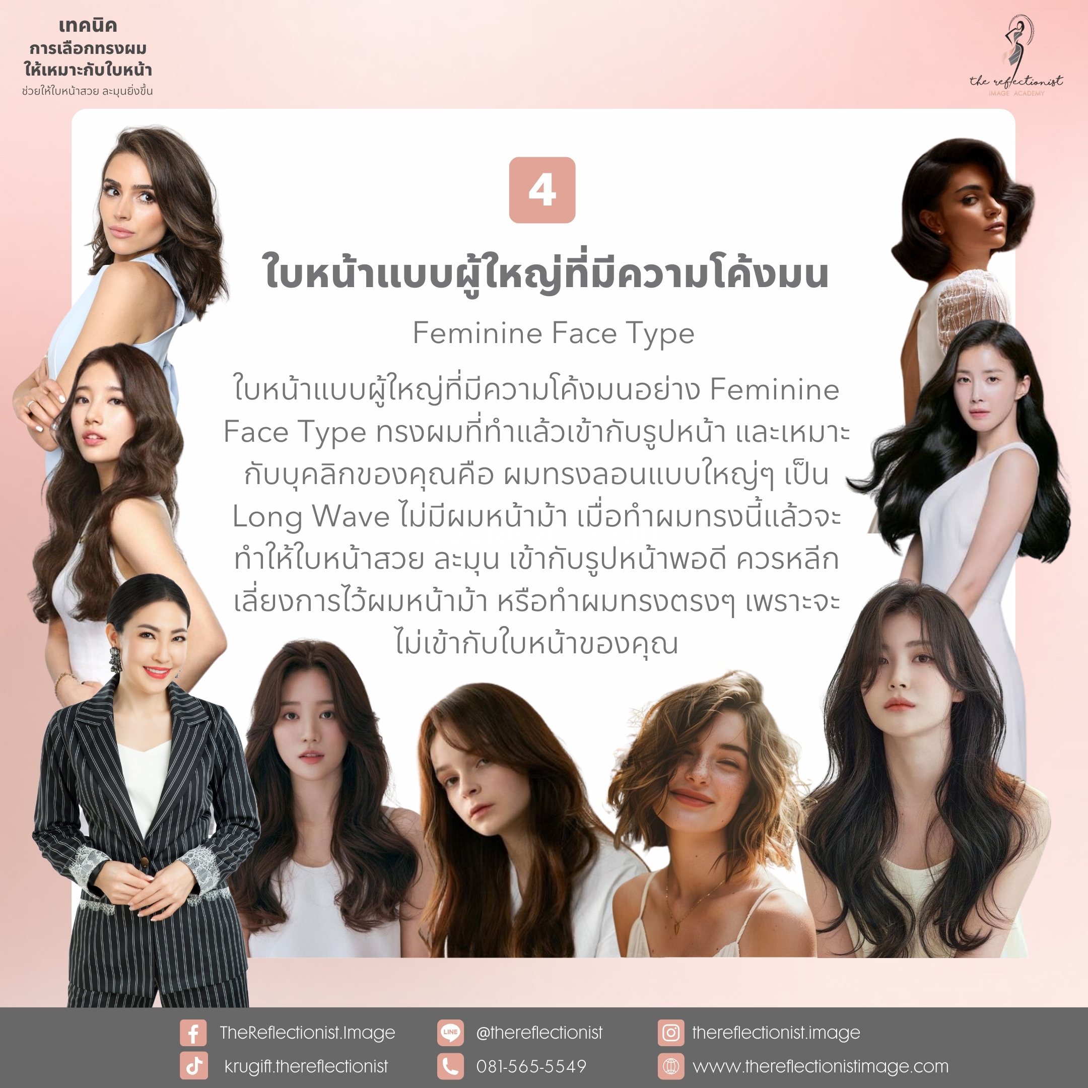 ใบหน้าแบบผู้ใหญ่ที่มีความโค้งมนอย่าง Feminine Face Type ทรงผมที่ทำแล้วเข้ากับรูปหน้า และเหมาะกับบุคลิกของคุณคือ ผมทรงลอนแบบใหญ่ๆ เป็น Long Wave ไม่มีผมหน้าม้า เมื่อทำผมทรงนี้แล้วจะทำให้ใบหน้าสวย ละมุน เข้ากับรูปหน้าพอดี ควรหลีกเลี่ยงการไว้ผมหน้าม้า หรือทำผมทรงตรงๆ เพราะจะไม่เข้ากับใบหน้าของคุณ