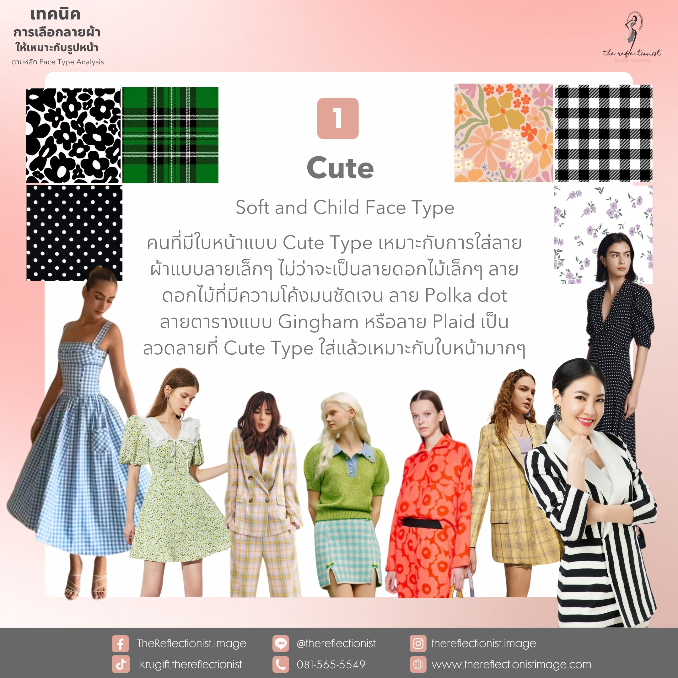 คนที่มีใบหน้าแบบ Cute Type เหมาะกับการใส่ลายผ้าแบบลายเล็กๆ ไม่ว่าจะเป็นลายดอกไม้เล็กๆ ลายดอกไม้ที่มีความโค้งมนชัดเจน ลาย Polka dot ลายตารางแบบ Gingham หรือลาย Plaid เป็นลวดลายที่ Cute Type ใส่แล้วเหมาะกับใบหน้ามากๆ