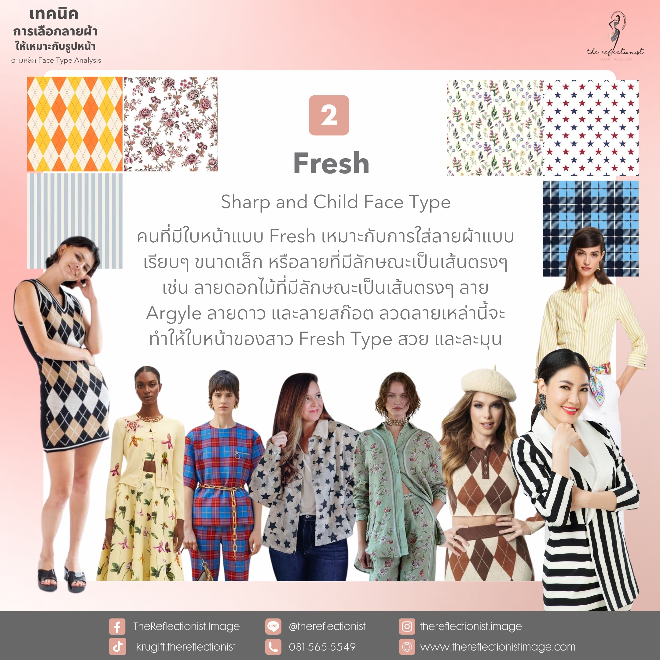 คนที่มีใบหน้าแบบ Fresh เหมาะกับการใส่ลายผ้าแบบเรียบๆ ขนาดเล็ก หรือลายที่มีลักษณะเป็นเส้นตรงๆ เช่น ลายดอกไม้ที่มีลักษณะเป็นเส้นตรงๆ ลาย Argyle ลายดาว และลายสก๊อต ลวดลายเหล่านี้จะทำให้ใบหน้าของสาว Fresh Type สวย และละมุน