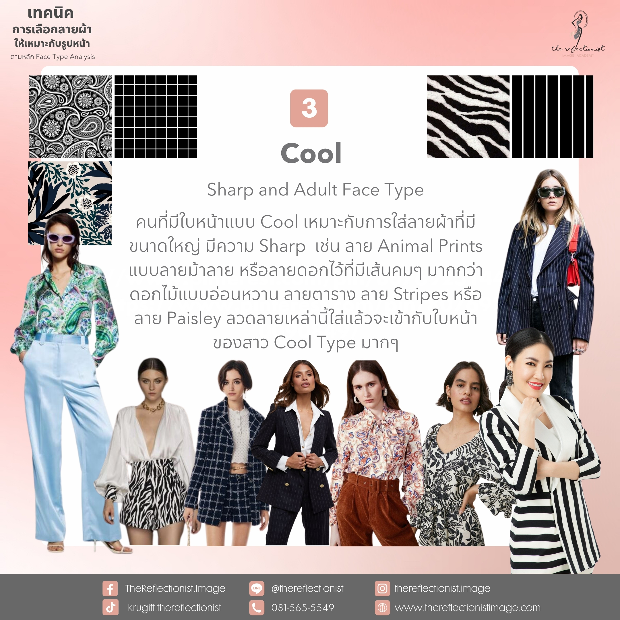 คนที่มีใบหน้าแบบ Cool เหมาะกับการใส่ลายผ้าที่มีขนาดใหญ่ มีความ Sharp เช่น ลาย Animal Prints แบบลายม้าลาย หรือลายดอกไว้ที่มีเส้นคมๆ มากกว่าดอกไม้แบบอ่อนหวาน ลายตาราง ลาย Stripes หรือลาย Paisley ลวดลายเหล่านี้ใส่แล้วจะเข้ากับใบหน้าของสาว Cool Type มากๆ