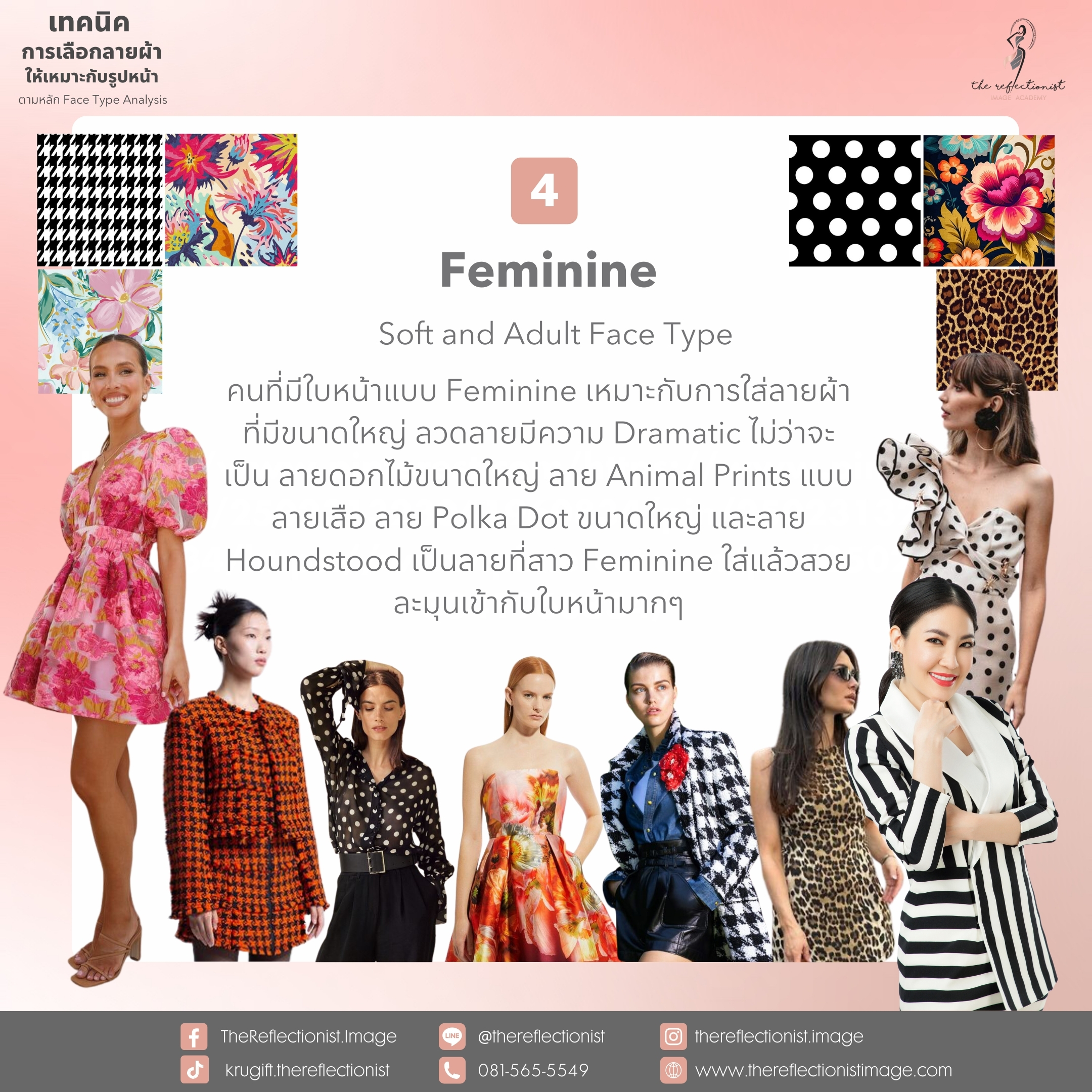 คนที่มีใบหน้าแบบ Feminine เหมาะกับการใส่ลายผ้าที่มีขนาดใหญ่ ลวดลายมีความ Dramatic ไม่ว่าจะเป็น ลายดอกไม้ขนาดใหญ่ ลาย Animal Prints แบบลายเสือ ลาย Polka Dot ขนาดใหญ่ และลาย Houndstood เป็นลายที่สาว Feminine ใส่แล้วสวยละมุนเข้ากับใบหน้ามากๆ