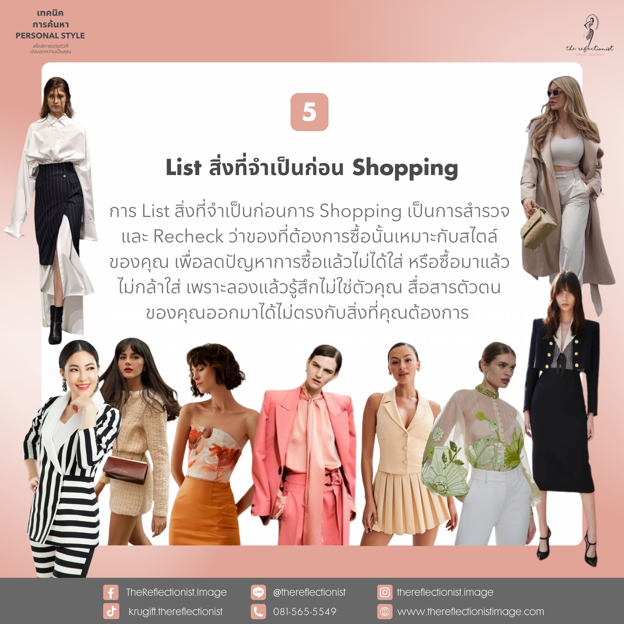 การ List สิ่งที่จำเป็นก่อนการ Shopping เป็นการสำรวจ และ Recheck ว่าของที่ต้องการซื้อนั้นเหมาะกับสไตล์ของคุณ เพื่อลดปัญหาการซื้อแล้วไม่ได้ใส่ หรือซื้อมาแล้วไม่กล้าใส่ เพราะลองแล้วรู้สึกไม่ใช่ตัวคุณ สื่อสารตัวตนของคุณออกมาได้ไม่ตรงกับสิ่งที่คุณต้องการ