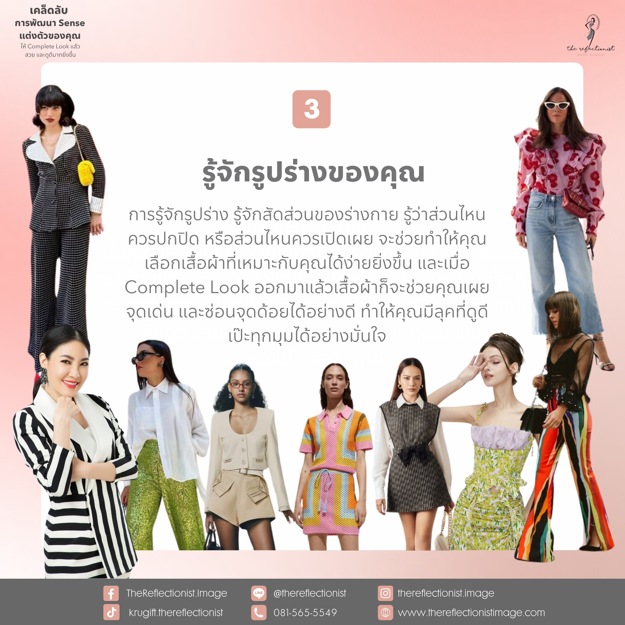 การรู้จักรูปร่าง รู้จักสัดส่วนของร่างกาย รู้ว่าส่วนไหนควรปกปิด หรือส่วนไหนควรเปิดเผย จะช่วยทำให้คุณเลือกเสื้อผ้าที่เหมาะกับคุณได้ง่ายยิ่งขึ้น และเมื่อ Complete Look ออกมาแล้วเสื้อผ้าก็จะช่วยคุณเผยจุดเด่น และซ่อนจุดด้อยได้อย่างดี ทำให้คุณมีลุคที่ดูดี เป๊ะทุกมุมได้อย่างมั่นใจ