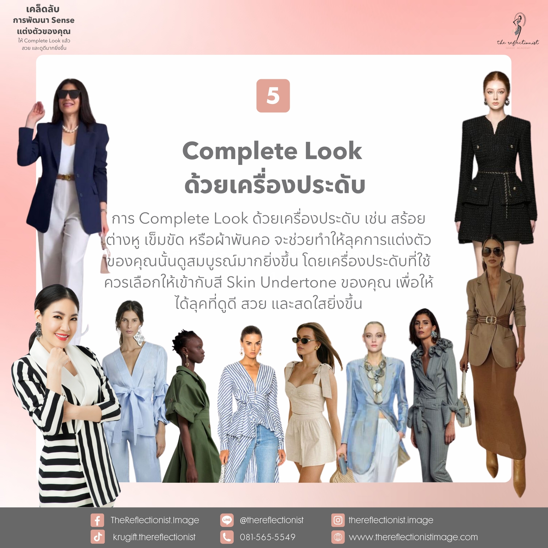 การ Complete Look ด้วยเครื่องประดับ เช่น สร้อย ต่างหู เข็มขัด หรือผ้าพันคอ จะช่วยทำให้ลุคการแต่งตัวของคุณนั้นดูสมบูรณ์มากยิ่งขึ้น โดยเครื่องประดับที่ใช้ควรเลือกให้เข้ากับสี Skin Undertone ของคุณ เพื่อให้ได้ลุคที่ดูดี สวย และสดใสยิ่งขึ้น