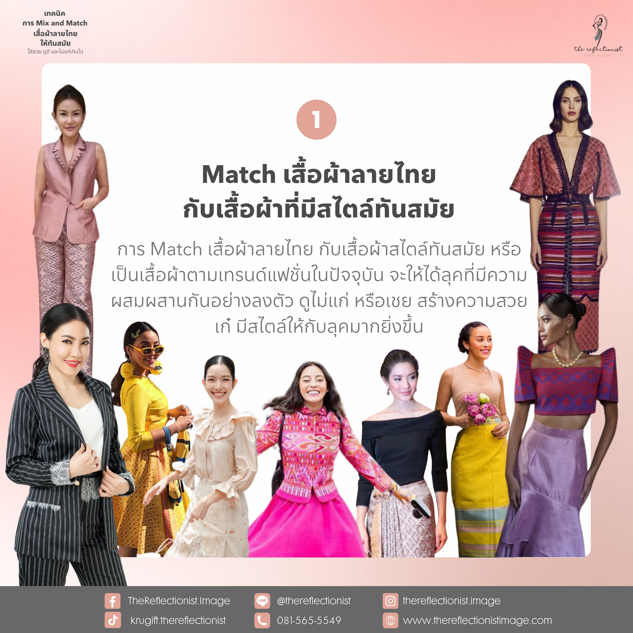 การ Match เสื้อผ้าลายไทย กับเสื้อผ้าสไตล์ทันสมัย หรือเป็นเสื้อผ้าตามเทรนด์แฟชั่นในปัจจุบัน จะให้ได้ลุคที่มีความผสมผสานกันอย่างลงตัว ดูไม่แก่ หรือเชย สร้างความสวย เก๋ มีสไตล์ให้กับลุคมากยิ่งขึ้น