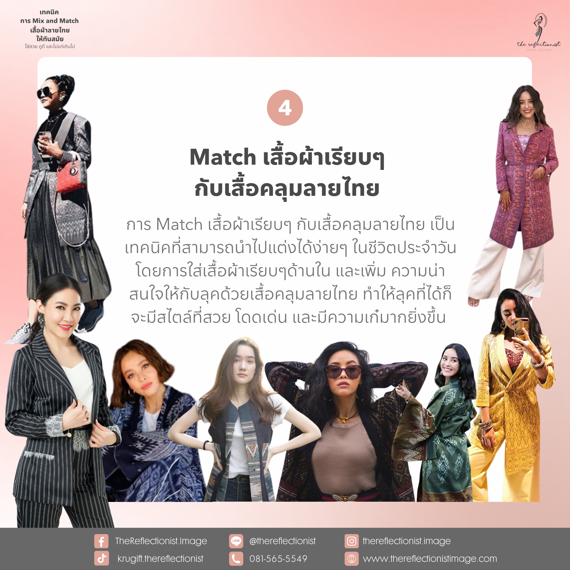 การ Match เสื้อผ้าเรียบๆ กับเสื้อคลุมลายไทย เป็นเทคนิคที่สามารถนำไปแต่งได้ง่ายๆ ในชีวิตประจำวัน โดยการใส่เสื้อผ้าเรียบๆด้านใน และเพิ่ม ความน่าสนใจให้กับลุคด้วยเสื้อคลุมลายไทย ทำให้ลุคที่ได้ก็จะมีสไตล์ที่สวย โดดเด่น และมีความเก๋มากยิ่งขึ้น