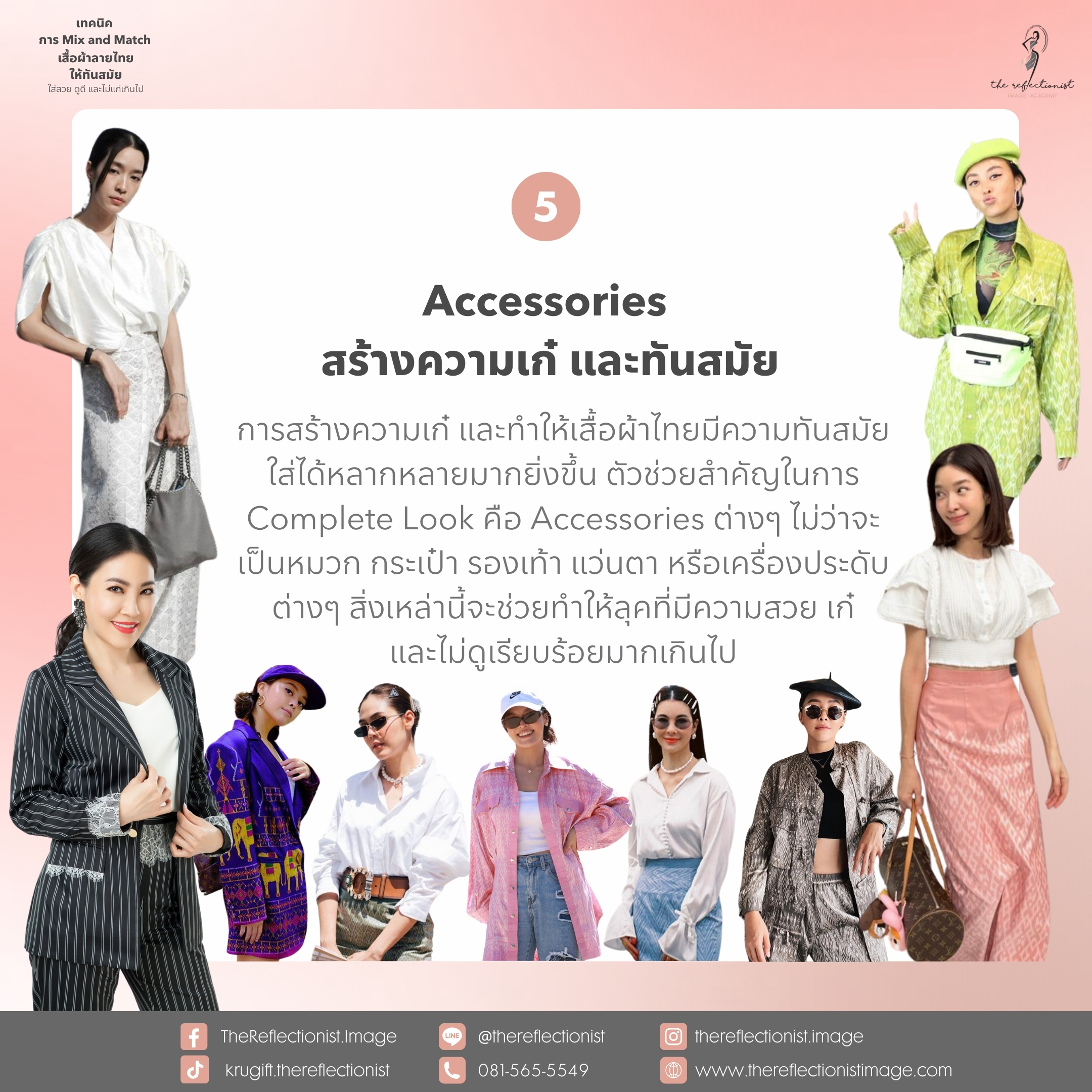 การสร้างความเก๋ และทำให้เสื้อผ้าไทยมีความทันสมัย ใส่ได้หลากหลายมากยิ่งขึ้น ตัวช่วยสำคัญในการ Complete Look คือ Accessories ต่างๆ ไม่ว่าจะเป็นหมวก กระเป๋า รองเท้า แว่นตา หรือเครื่องประดับต่างๆ สิ่งเหล่านี้จะช่วยทำให้ลุคที่มีความสวย เก๋ และไม่ดูเรียบร้อยมากเกินไป