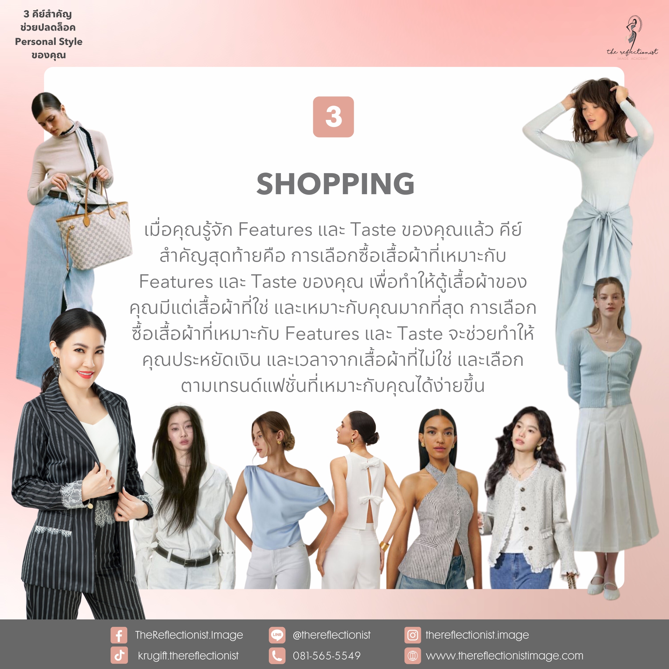 เมื่อคุณรู้จัก Features และ Taste ของคุณแล้ว คีย์สำคัญสุดท้ายคือ การเลือกซื้อเสื้อผ้าที่เหมาะกับ Features และ Taste ของคุณ เพื่อทำให้ตู้เสื้อผ้าของคุณมีแต่เสื้อผ้าที่ใช่ และเหมาะกับคุณมากที่สุด การเลือกซื้อเสื้อผ้าที่เหมาะกับ Features และ Taste จะช่วยทำให้คุณประหยัดเงิน และเวลาจากเสื้อผ้าที่ไม่ใช่ และเลือกตามเทรนด์แฟชั่นที่เหมาะกับคุณได้ง่ายขึ้น