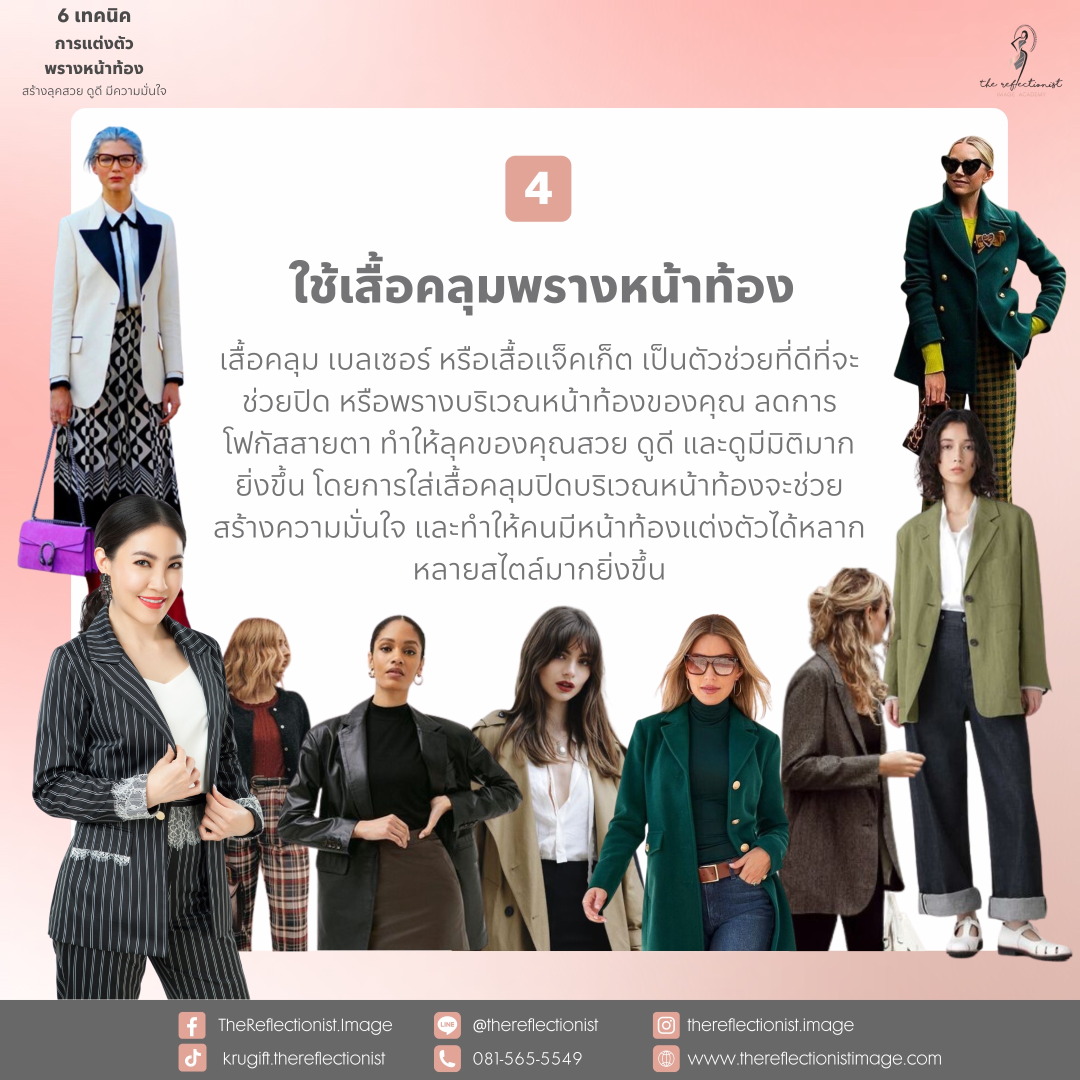 เสื้อคลุม เบลเซอร์ หรือเสื้อแจ็คเก็ต เป็นตัวช่วยที่ดีที่จะช่วยปิด หรือพรางบริเวณหน้าท้องของคุณ ลดการโฟกัสสายตา ทำให้ลุคของคุณสวย ดูดี และดูมีมิติมากยิ่งขึ้น โดยการใส่เสื้อคลุมปิดบริเวณหน้าท้องจะช่วยสร้างความมั่นใจ และทำให้คนมีหน้าท้องแต่งตัวได้หลากหลายสไตล์มากยิ่งขึ้น