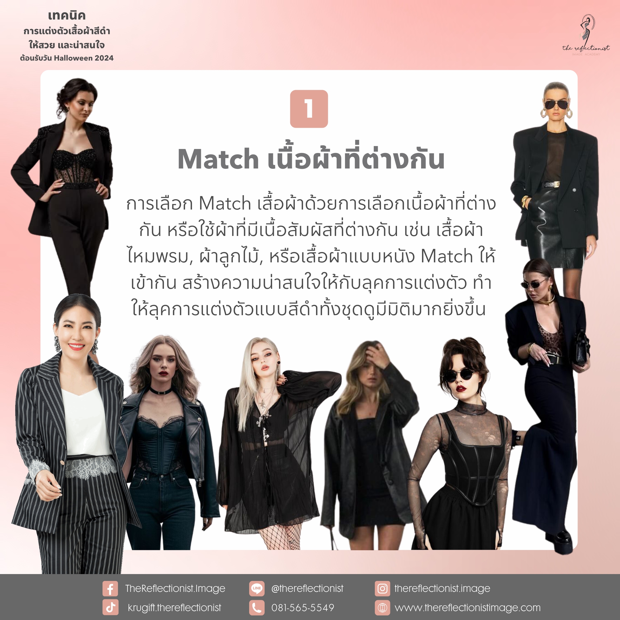 การเลือก Match เสื้อผ้าด้วยการเลือกเนื้อผ้าที่ต่างกัน หรือใช้ผ้าที่มีเนื้อสัมผัสที่ต่างกัน เช่น เสื้อผ้าไหมพรม, ผ้าลูกไม้, หรือเสื้อผ้าแบบหนัง Match ให้เข้ากัน สร้างความน่าสนใจให้กับลุคการแต่งตัว ทำให้ลุคการแต่งตัวแบบสีดำทั้งชุดดูมีมิติมากยิ่งขึ้น