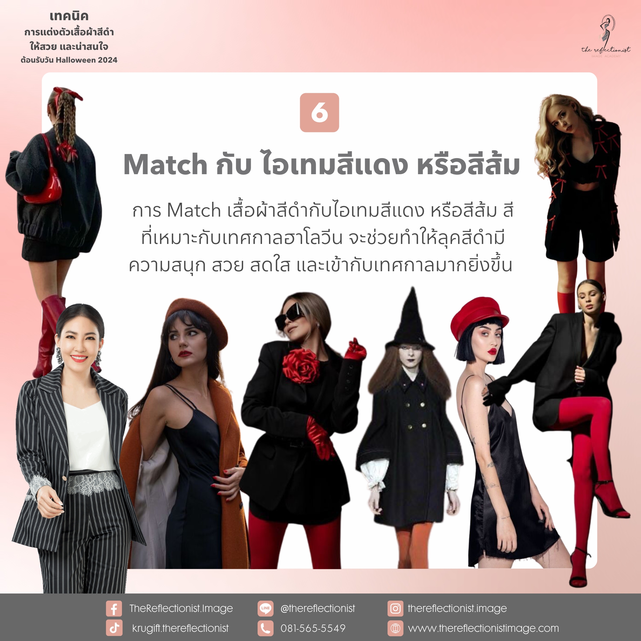 การ Match เสื้อผ้าสีดำกับไอเทมสีแดง หรือสีส้ม สีที่เหมาะกับเทศกาลฮาโลวีน จะช่วยทำให้ลุคสีดำมีความสนุก สวย สดใส และเข้ากับเทศกาลมากยิ่งขึ้น