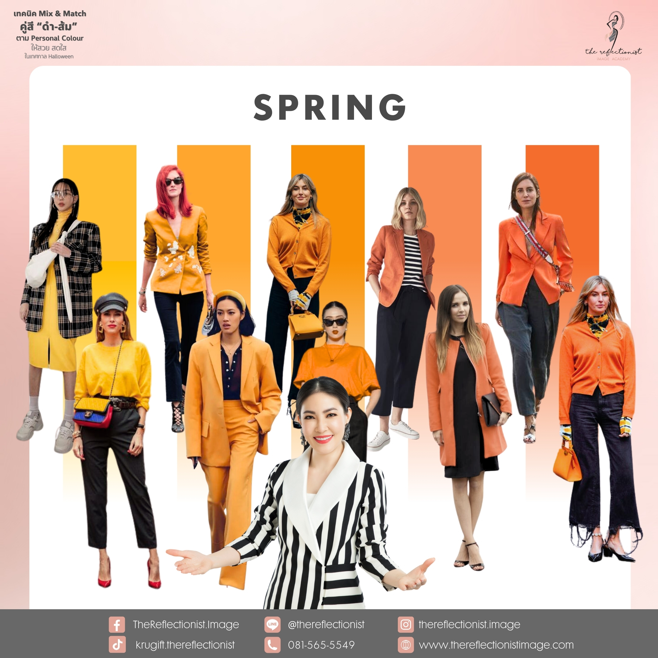 คุณจะเห็นว่า Spring และ Autumn ที่เป็น Warm tone มีโทนสีส้มไปจนถึงโทนสีเหลืองเลือกให้คุณเลือกใส่ได้หลากหลาย และควร Matching กับสีดำให้ไกลกับบริเวณใบหน้าของคุณ เพื่อเพิ่มความสวย และความสดใสให้กับใบหน้า
