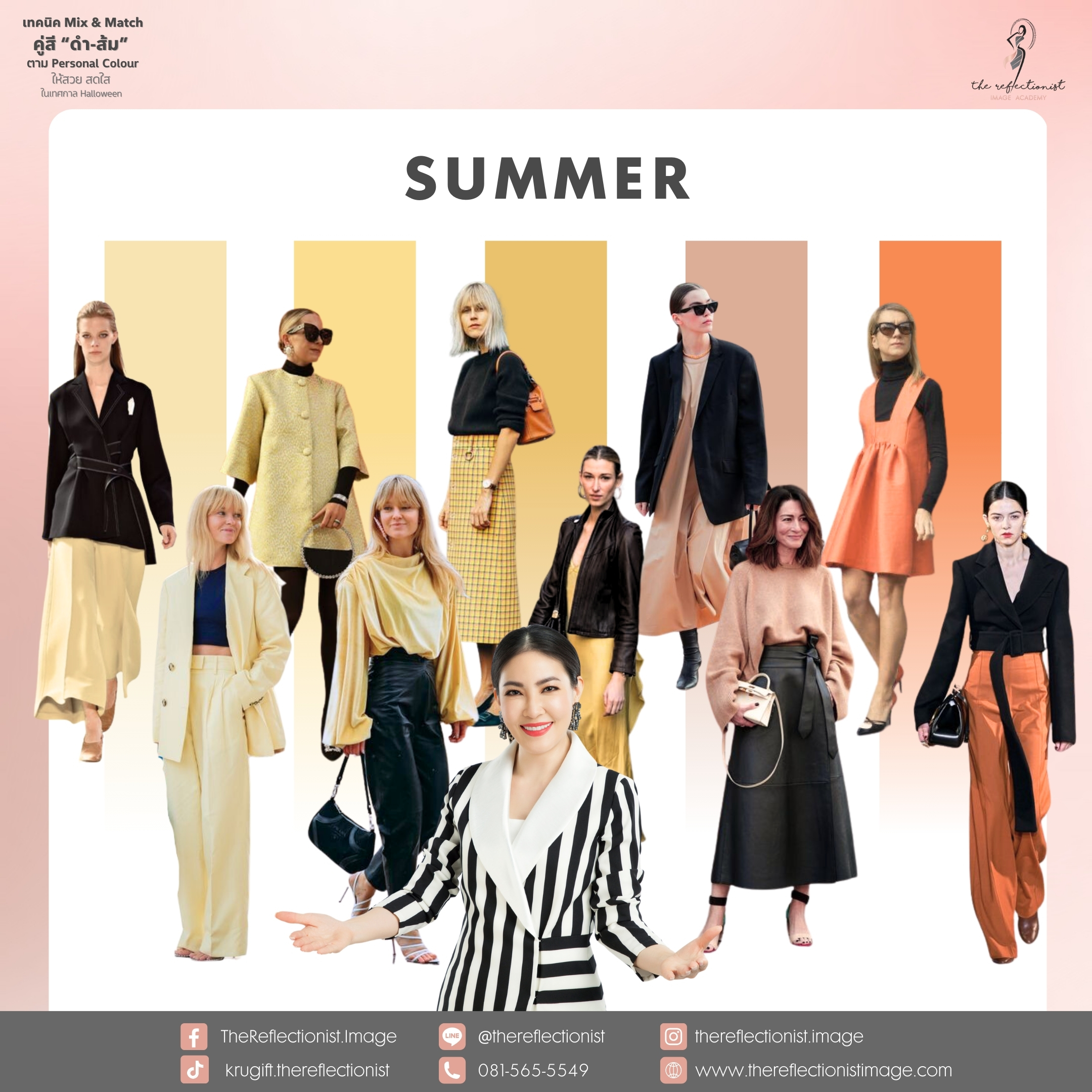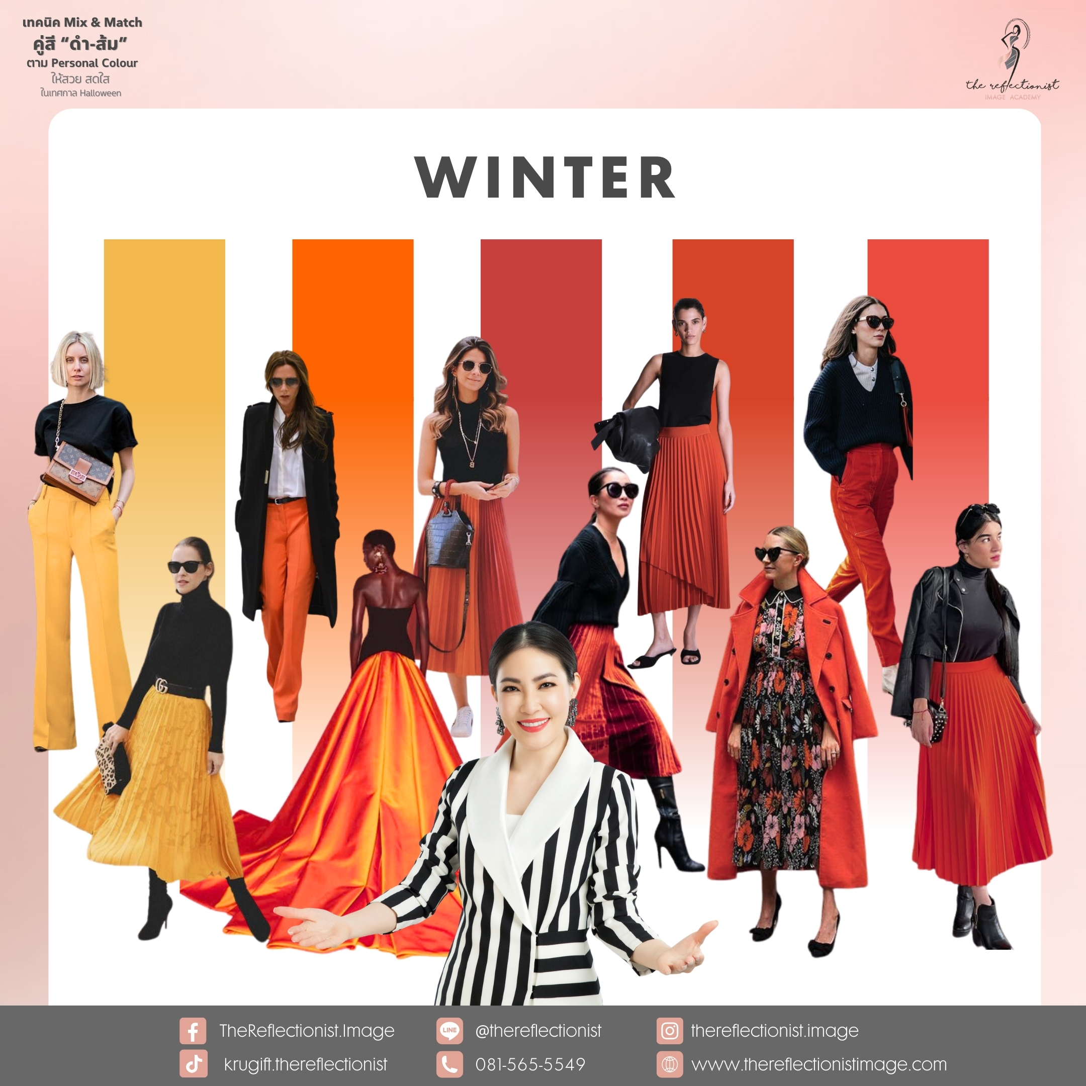 ส่วน Winter และ Summer คุณจะได้ว่ามีโทนสีส้ม สีเหลือง และสีส้มติดแดงที่สามารถใส่ได้ในบางเฉด แต่เนื่องจากเป็นสีที่ไม่เหมาะกับคนที่เป็น Cool tone อย่าง Winter และ Summer มากนัก ครูกิ๊ฟจึงอยากแนะนำให้คุณเลือกใส่เป็นท่อนล่างที่ไกลกับใบหน้าของคุณแทน และเลือกใส่สีดำที่เหมาะกับคน Cool tone มากในท่อนบน เพื่อทำให้คุณมีลุคที่สวย ดูดี และมีใบหน้าที่สดใสยิ่งขึ้น