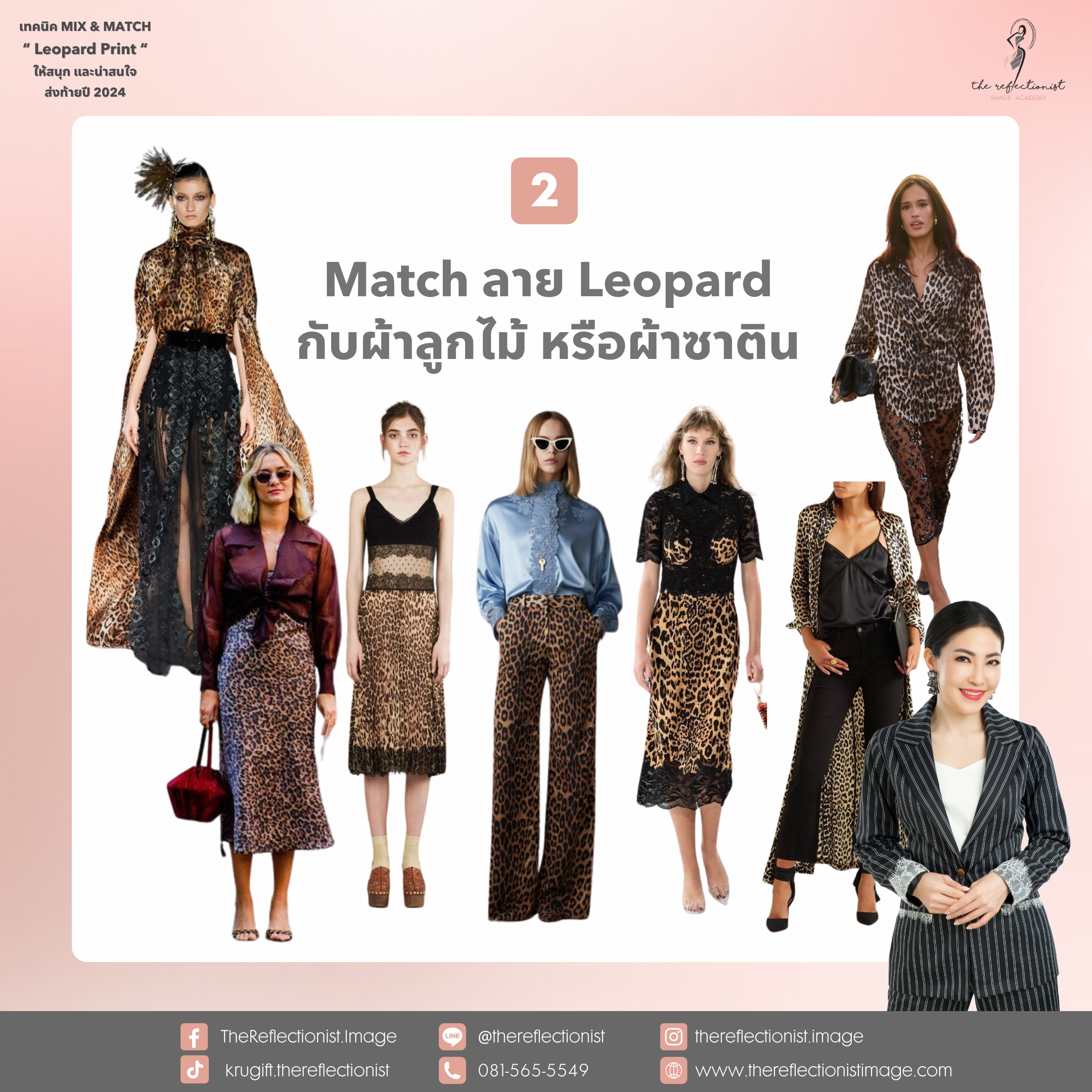 การจับคู่ลาย Leopard กับเสื้อผ้าที่มีลวดลาย แบบ Pattern on pattern จะช่วยทำให้ลุคการแต่งตัวมีมิติ มีความสนุกสนาน โดดเด่น และมีความ Creative เป็นการสร้างความสดใสให้กับลุคการแต่งตัวลายเสือ
