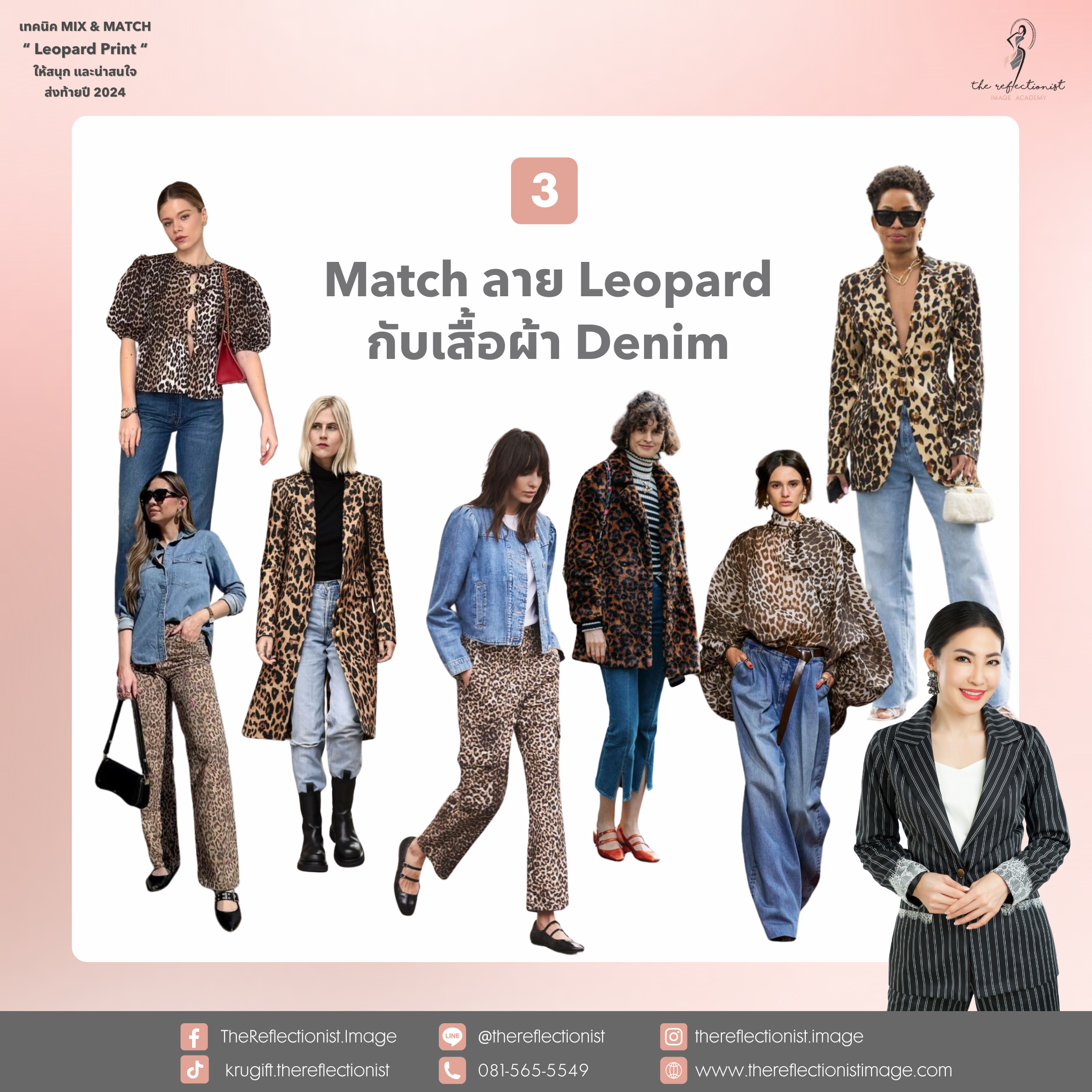 การจับคู่ลาย Leopard กับเสื้อผ้า Denim จะทำให้ได้ลุคที่ดูสบายๆ แต่มีความน่าสนใจ มีมิติในการแต่งตัวมากยิ่งขึ้น ซึ่งเป็นอีกหนึ่งเทคนิคง่ายๆที่คุณสามารถลองแต่งตามได้
