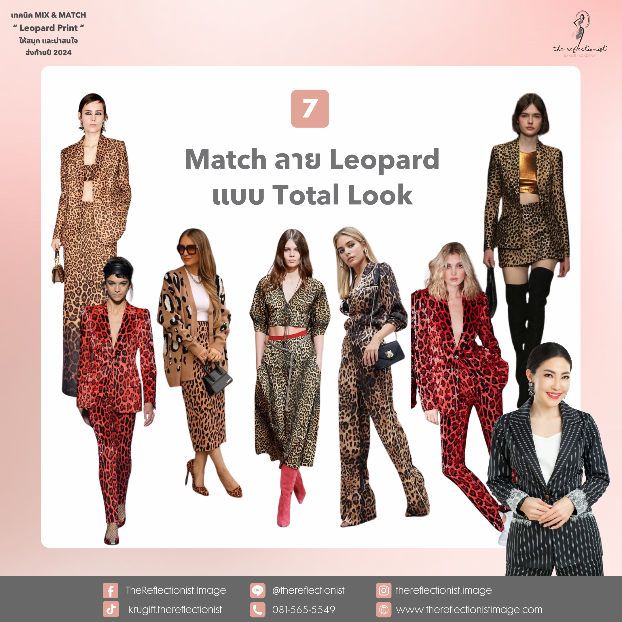 การจับคู่ลาย Leopard แบบ Total Look ทั้งชุด เป็นเทคนิคที่เหมาะกับสาว Creative ที่มีความมั่นใจ เพราะลุคที่ได้จะโดดเด่น ดูมีพลัง และดึงดูดสายตามาก เหมาะกับการใส่ออกงาน หรืองานปาร์ตี้ที่ต้องการลุคการแต่งตัวที่สนุก และโดดเด่น