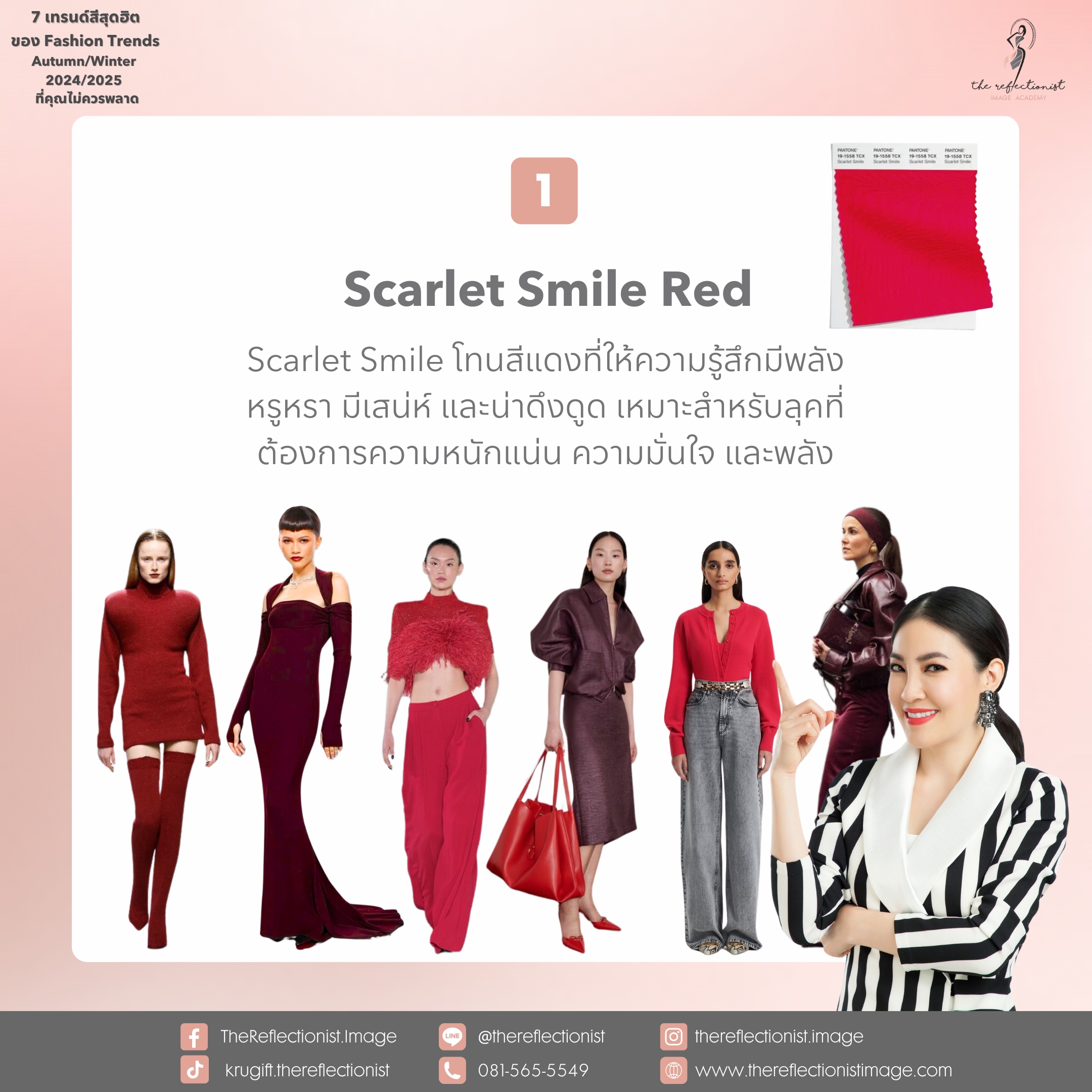 Scarlet Smile โทนสีแดงที่ให้ความรู้สึกมีพลัง หรูหรา มีเสน่ห์ และน่าดึงดูด เหมาะสำหรับลุคที่ต้องการความหนักแน่น ความมั่นใจ และพลัง