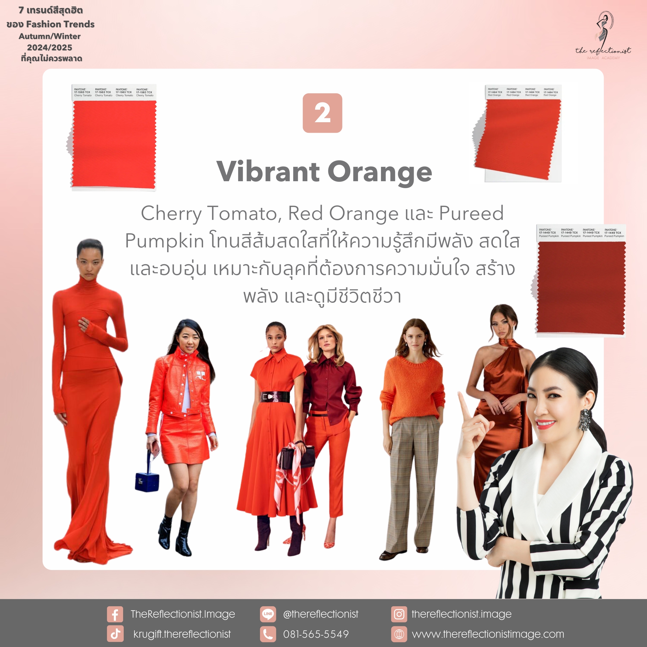 Cherry Tomato, Red Orange และ Pureed Pumpkin โทนสีส้มสดใสที่ให้ความรู้สึกมีพลัง สดใส และอบอุ่น เหมาะกับลุคที่ต้องการความมั่นใจ สร้างพลัง และดูมีชีวิตชีวา