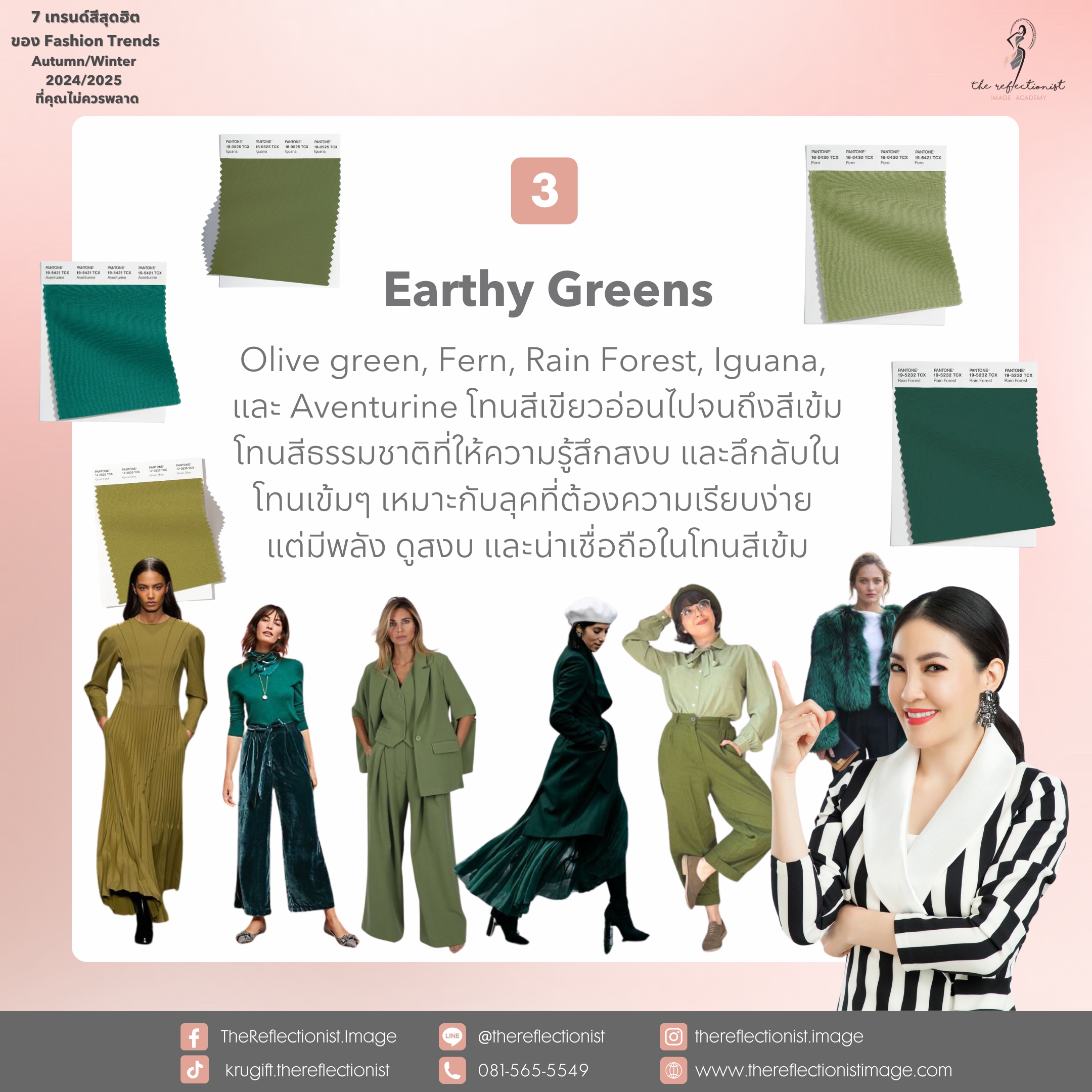 Olive green, Fern, Rain Forest, Iguana, และ Aventurine โทนสีเขียวอ่อนไปจนถึงสีเข้ม โทนสีธรรมชาติที่ให้ความรู้สึกสงบ และลึกลับในโทนเข้มๆ เหมาะกับลุคที่ต้องความเรียบง่าย แต่มีพลัง ดูสงบ และน่าเชื่อถือในโทนสีเข้ม