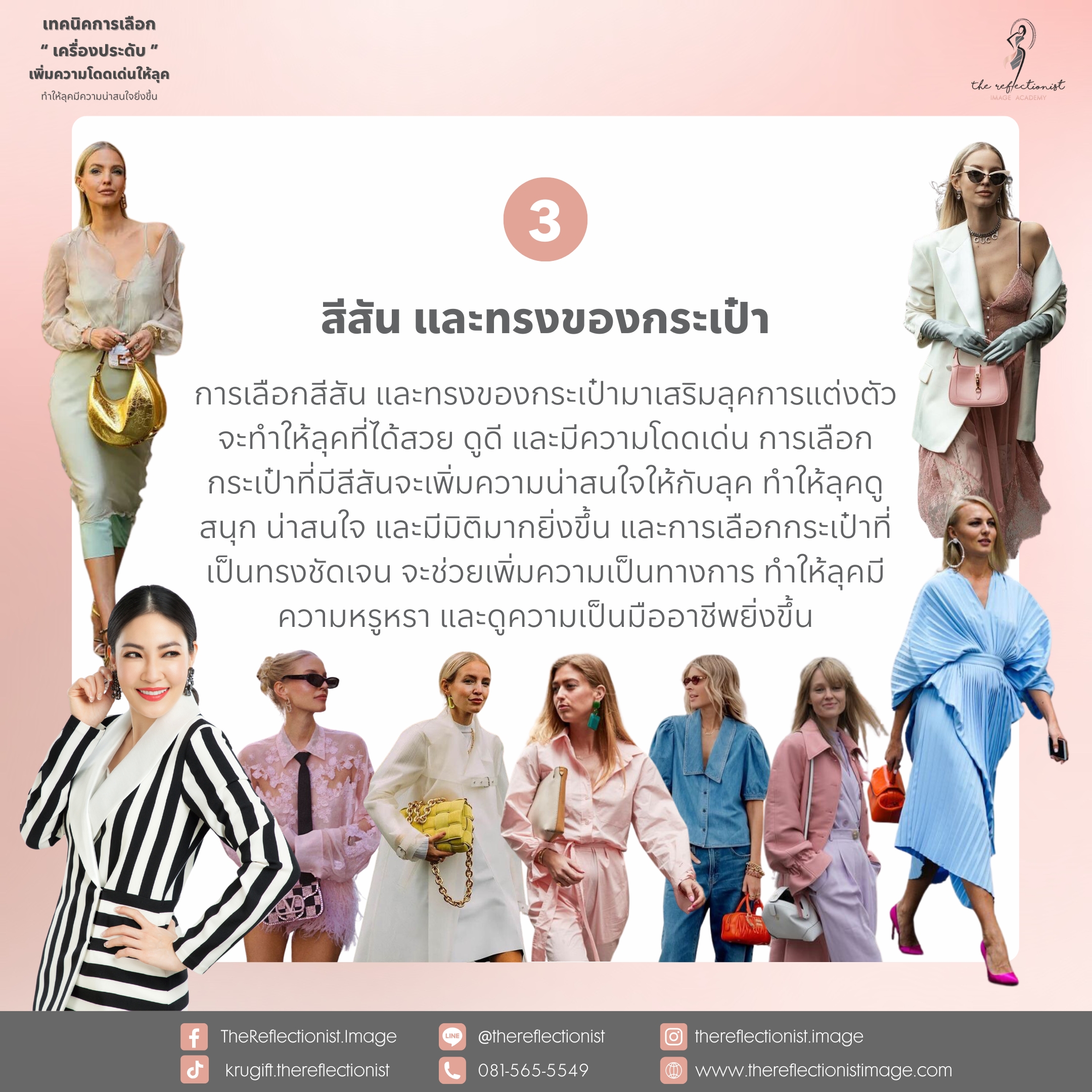 การเลือกสีสัน และทรงของกระเป๋ามาเสริมลุคการแต่งตัว จะทำให้ลุคที่ได้สวย ดูดี และมีความโดดเด่น การเลือกกระเป๋าที่มีสีสันจะเพิ่มความน่าสนใจให้กับลุค ทำให้ลุคดูสนุก น่าสนใจ และมีมิติมากยิ่งขึ้น และการเลือกกระเป๋าที่เป็นทรงชัดเจน จะช่วยเพิ่มความเป็นทางการ ทำให้ลุคมีความหรูหรา และดูความเป็นมืออาชีพยิ่งขึ้น