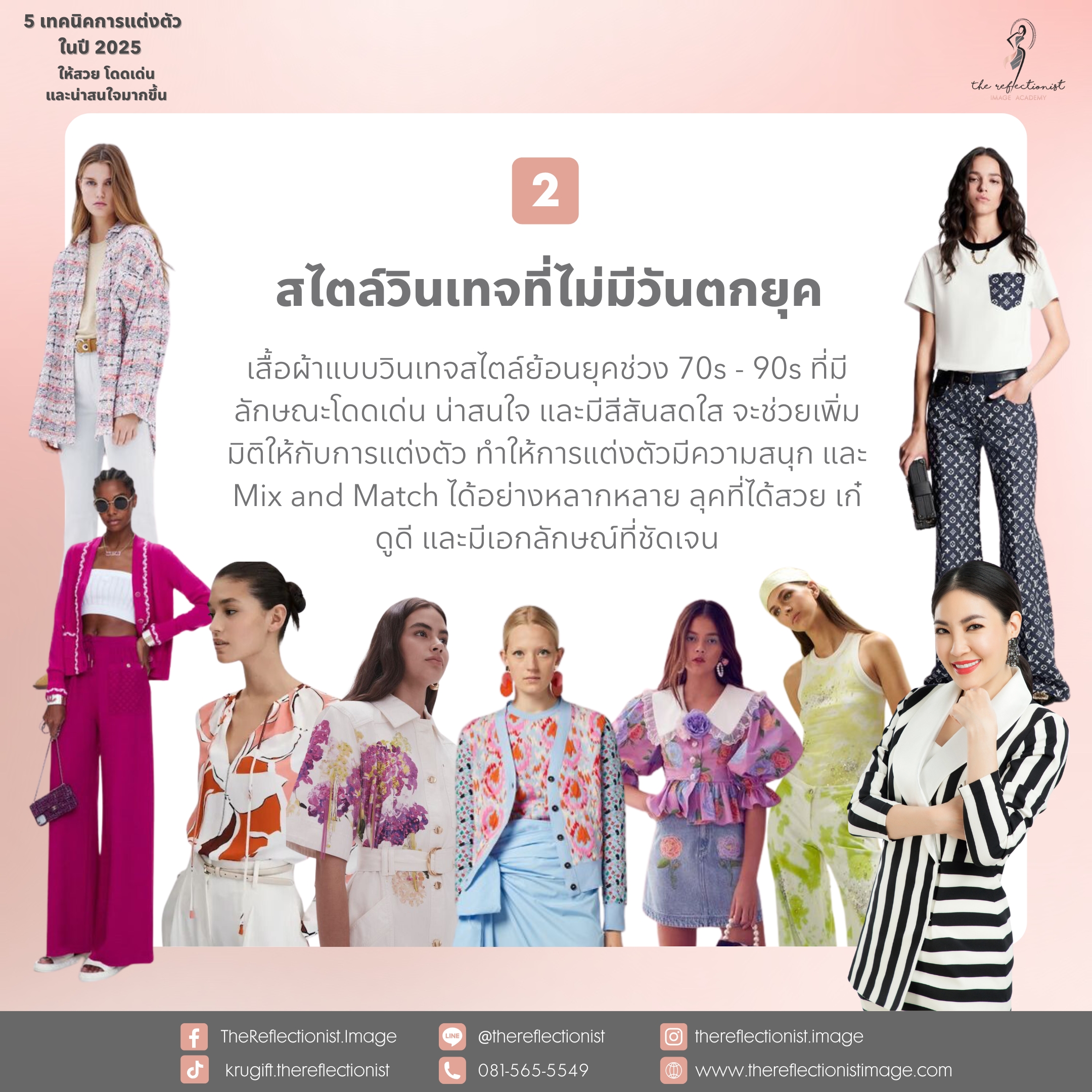 เสื้อผ้าแบบวินเทจสไตล์ย้อนยุคช่วง 70s - 90s ที่มีลักษณะโดดเด่น น่าสนใจ และมีสีสันสดใส จะช่วยเพิ่มมิติให้กับการแต่งตัว ทำให้การแต่งตัวมีความสนุก และ Mix and Match ได้อย่างหลากหลาย ลุคที่ได้สวย เก๋ ดูดี และมีเอกลักษณ์ที่ชัดเจน