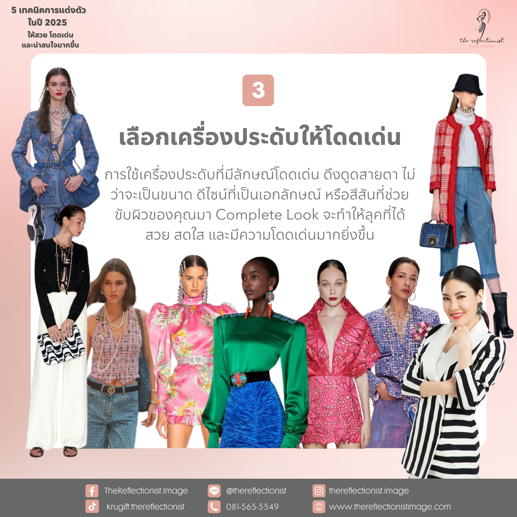 การใช้เครื่องประดับที่มีลักษณ์โดดเด่น ดึงดูดสายตา ไม่ว่าจะเป็นขนาด ดีไซน์ที่เป็นเอกลักษณ์ หรือสีสันที่ช่วยขับผิวของคุณมา Complete Look จะทำให้ลุคที่ได้สวย สดใส และมีความโดดเด่นมากยิ่งขึ้น