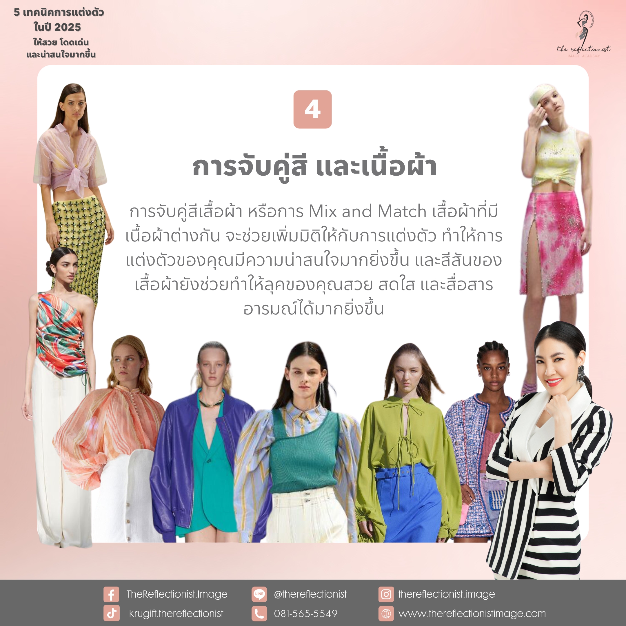การจับคู่สีเสื้อผ้า หรือการ Mix and Match เสื้อผ้าที่มีเนื้อผ้าต่างกัน จะช่วยเพิ่มมิติให้กับการแต่งตัว ทำให้การแต่งตัวของคุณมีความน่าสนใจมากยิ่งขึ้น และสีสันของเสื้อผ้ายังช่วยทำให้ลุคของคุณสวย สดใส และสื่อสารอารมณ์ได้มากยิ่งขึ้น