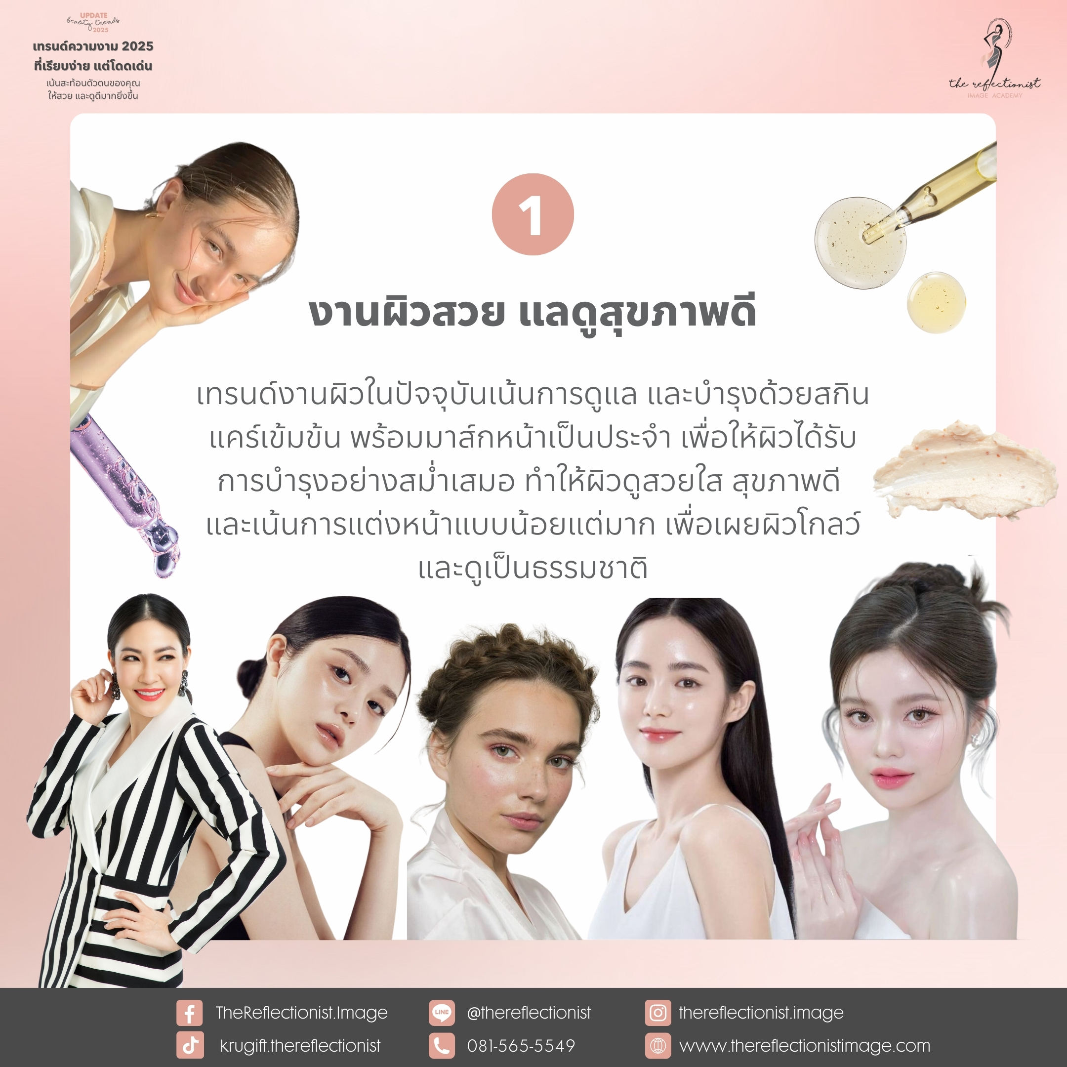 เทรนด์งานผิวในปัจจุบันเน้นการดูแล และบำรุงด้วยสกินแคร์เข้มข้น พร้อมมาส์กหน้าเป็นประจำ เพื่อให้ผิวได้รับการบำรุงอย่างสม่ำเสมอ ทำให้ผิวดูสวยใส สุขภาพดี และเน้นการแต่งหน้าแบบน้อยแต่มาก เพื่อเผยผิวโกลว์ และดูเป็นธรรมชาติ
