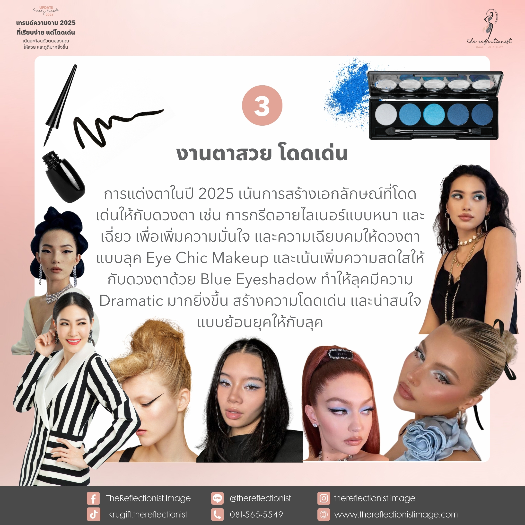 การแต่งตาในปี 2025 เน้นการสร้างเอกลักษณ์ที่โดดเด่นให้กับดวงตา เช่น การกรีดอายไลเนอร์แบบหนา และเฉี่ยว เพื่อเพิ่มความมั่นใจ และความเฉียบคมให้ดวงตา แบบลุค Eye Chic Makeup และเน้นเพิ่มความสดใสให้กับดวงตาด้วย Blue Eyeshadow ทำให้ลุคมีความ Dramatic มากยิ่งขึ้น สร้างความโดดเด่น และน่าสนใจแบบย้อนยุคให้กับลุค