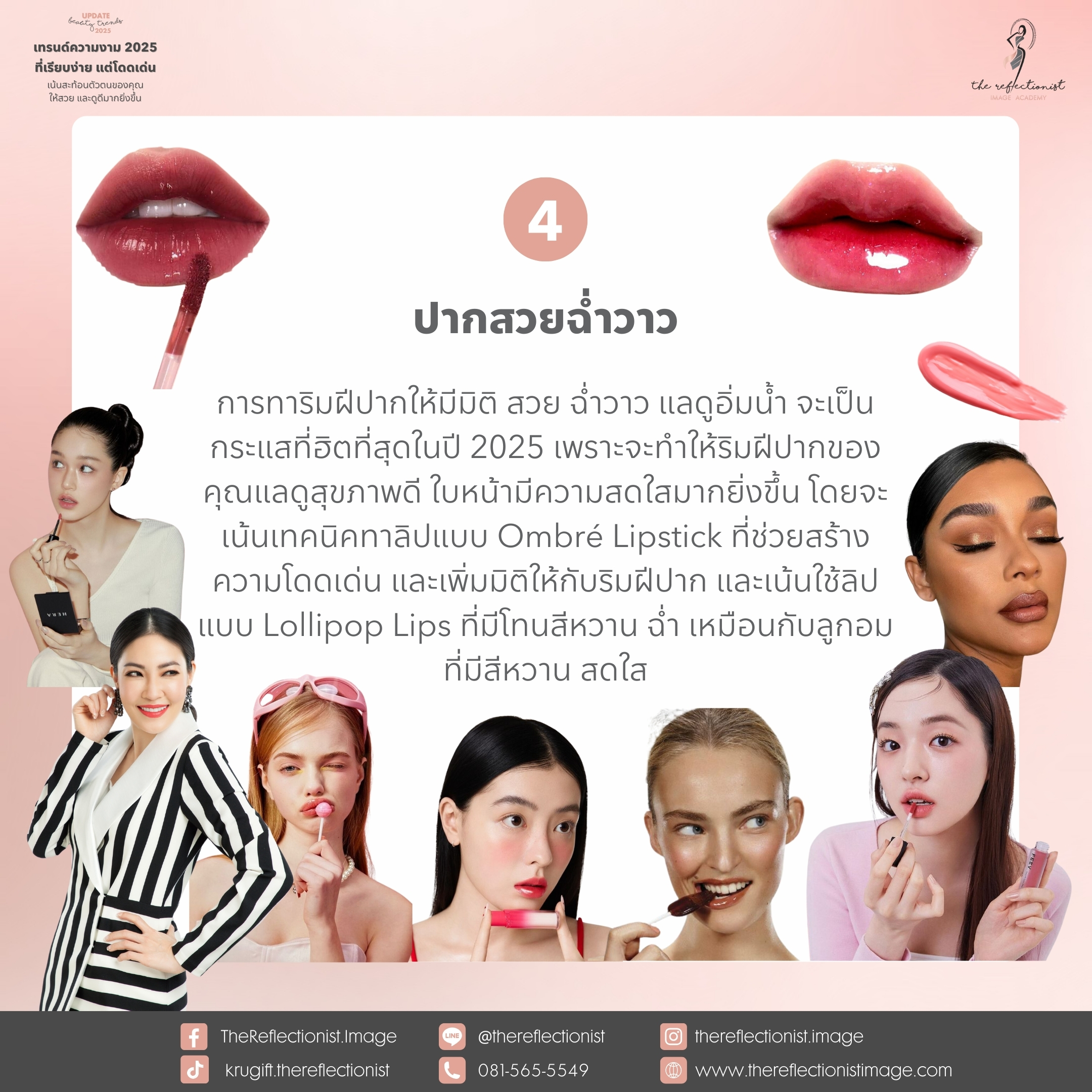 การทาริมฝีปากให้มีมิติ สวย ฉ่ำวาว แลดูอิ่มน้ำ จะเป็น กระแสที่ฮิตที่สุดในปี 2025 เพราะจะทำให้ริมฝีปากของคุณแลดูสุขภาพดี ใบหน้ามีความสดใสมากยิ่งขึ้น โดยจะเน้นเทคนิคทาลิปแบบ Ombré Lipstick ที่ช่วยสร้างความโดดเด่น และเพิ่มมิติให้กับริมฝีปาก และเน้นใช้ลิปแบบ Lollipop Lips ที่มีโทนสีหวาน ฉ่ำ เหมือนกับลูกอมที่มีสีหวาน สดใส