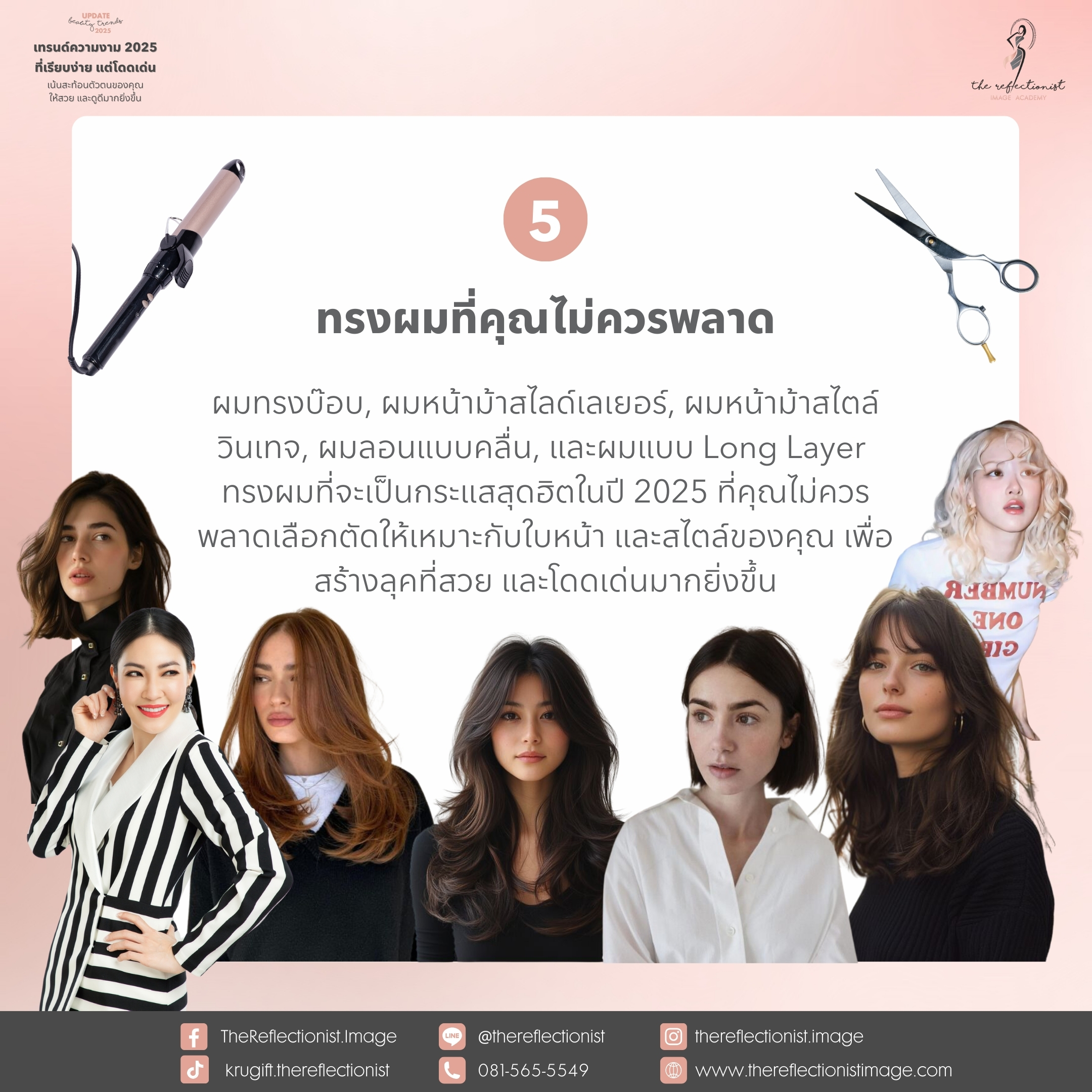 ผมทรงบ๊อบ, ผมหน้าม้าสไลด์เลเยอร์, ผมหน้าม้าสไตล์ วินเทจ, ผมลอนแบบคลื่น, และผมแบบ Long Layer ทรงผมที่จะเป็นกระแสสุดฮิตในปี 2025 ที่คุณไม่ควรพลาดเลือกตัดให้เหมาะกับใบหน้า และสไตล์ของคุณ เพื่อสร้างลุคที่สวย และโดดเด่นมากยิ่งขึ้น
