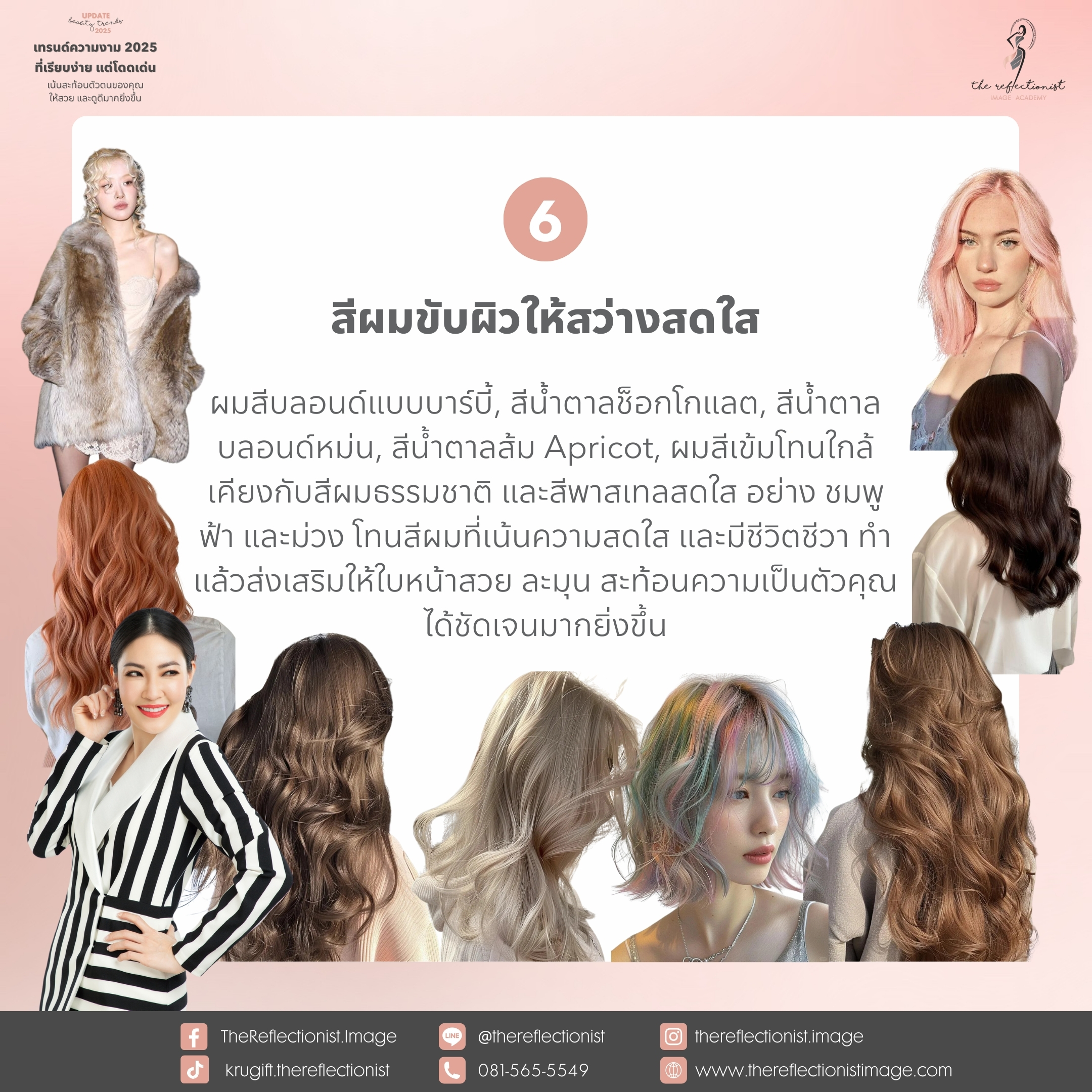 ผมสีบลอนด์แบบบาร์บี้, สีน้ำตาลช็อกโกแลต, สีน้ำตาล บลอนด์หม่น, สีน้ำตาลส้ม Apricot, ผมสีเข้มโทนใกล้เคียงกับสีผมธรรมชาติ และสีพาสเทลสดใส อย่าง ชมพู ฟ้า และม่วง โทนสีผมที่เน้นความสดใส และมีชีวิตชีวา ทำแล้วส่งเสริมให้ใบหน้าสวย ละมุน สะท้อนความเป็นตัวคุณได้ชัดเจนมากยิ่งขึ้น
