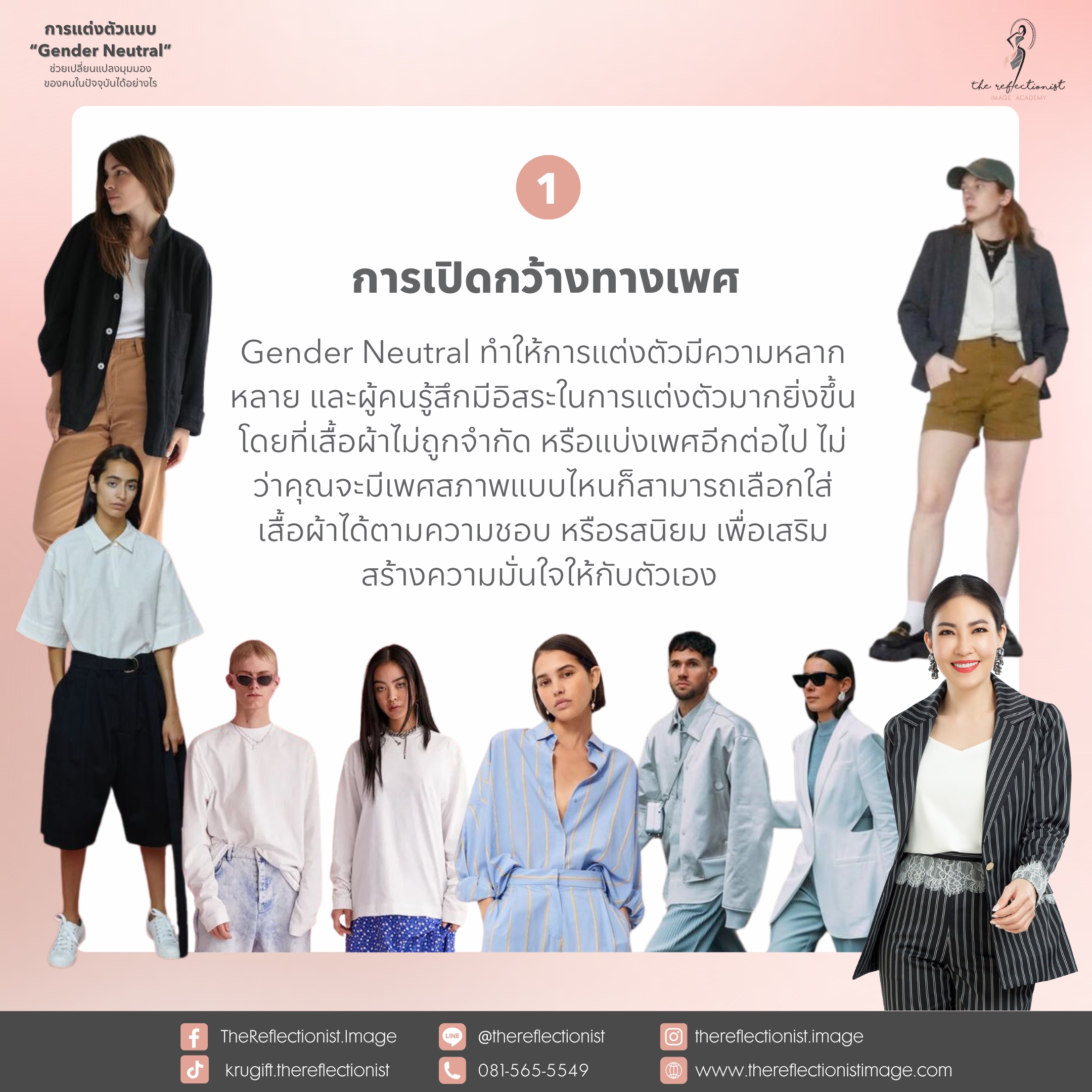 Gender Neutral ทำให้การแต่งตัวมีความหลากหลาย และผู้คนรู้สึกมีอิสระในการแต่งตัวมากยิ่งขึ้น โดยที่เสื้อผ้าไม่ถูกจำกัด หรือแบ่งเพศอีกต่อไป ไม่ว่าคุณจะมีเพศสภาพแบบไหนก็สามารถเลือกใส่เสื้อผ้าได้ตามความชอบ หรือรสนิยม เพื่อเสริมสร้างความมั่นใจให้กับตัวเอง