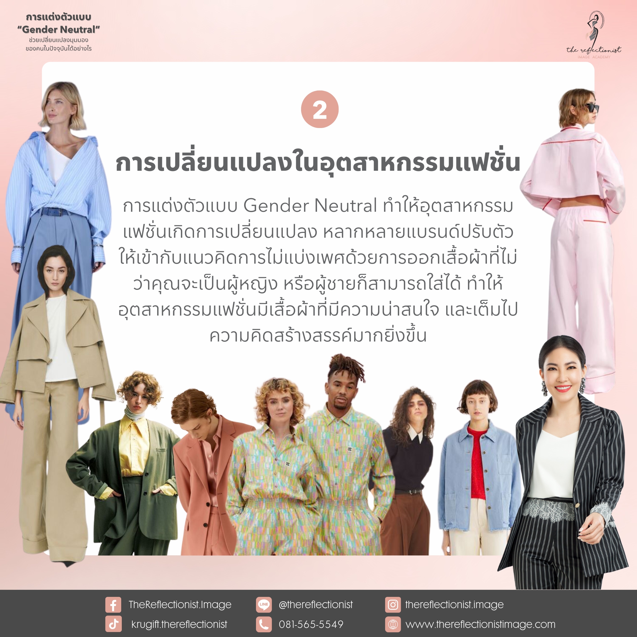 การแต่งตัวแบบ Gender Neutral ทำให้อุตสาหกรรมแฟชั่นเกิดการเปลี่ยนแปลง หลากหลายแบรนด์ปรับตัวให้เข้ากับแนวคิดการไม่แบ่งเพศด้วยการออกเสื้อผ้าที่ไม่ว่าคุณจะเป็นผู้หญิง หรือผู้ชายก็สามารถใส่ได้ ทำให้อุตสาหกรรมแฟชั่นมีเสื้อผ้าที่มีความน่าสนใจ และเต็มไปความคิดสร้างสรรค์มากยิ่งขึ้น