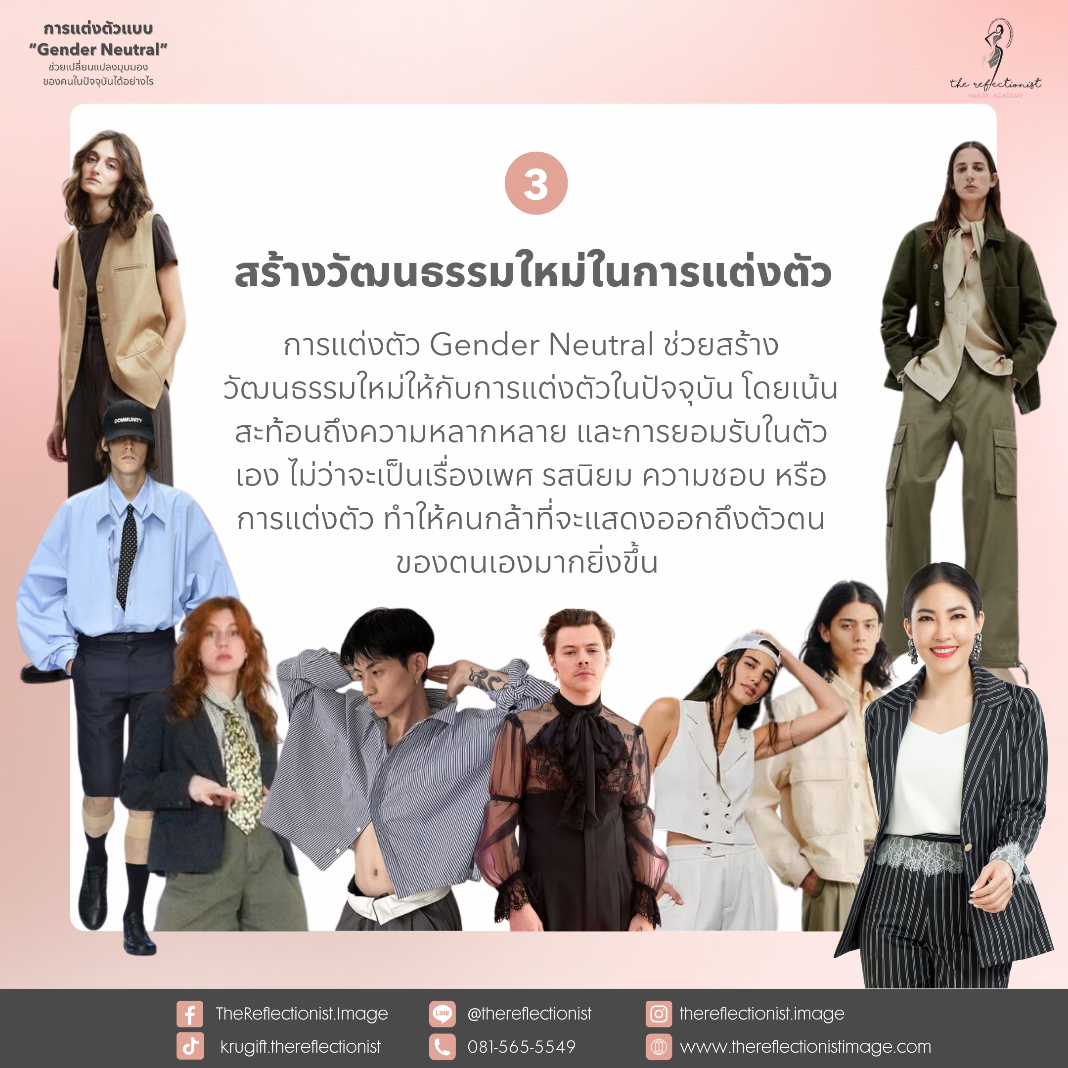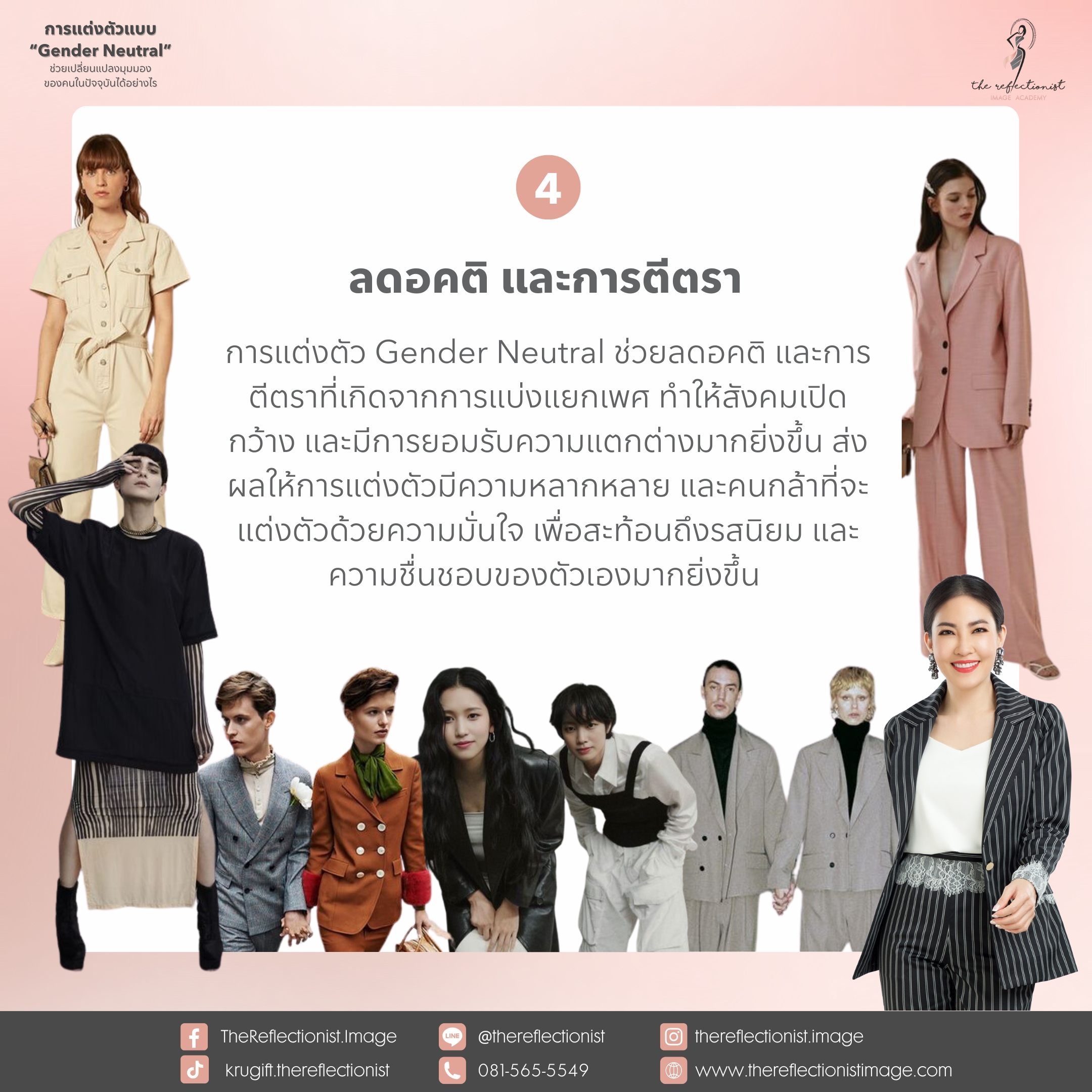 การแต่งตัว Gender Neutral ช่วยลดอคติ และการตีตราที่เกิดจากการแบ่งแยกเพศ ทำให้สังคมเปิดกว้าง และมีการยอมรับความแตกต่างมากยิ่งขึ้น ส่งผลให้การแต่งตัวมีความหลากหลาย และคนกล้าที่จะแต่งตัวด้วยความมั่นใจ เพื่อสะท้อนถึงรสนิยม และความชื่นชอบของตัวเองมากยิ่งขึ้น